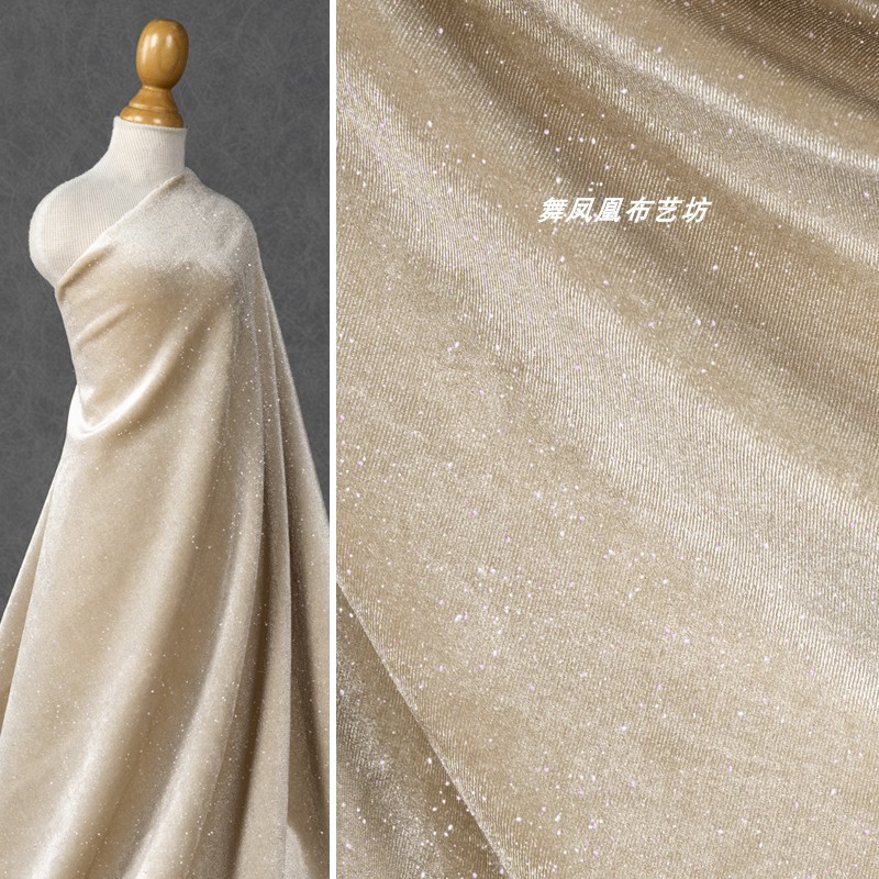 シャンパンの金色の星が輝いている韓国のベルベット生地のドレスの四面の弾力性が背景生地に垂れ下がっている