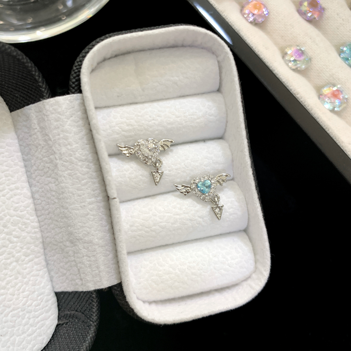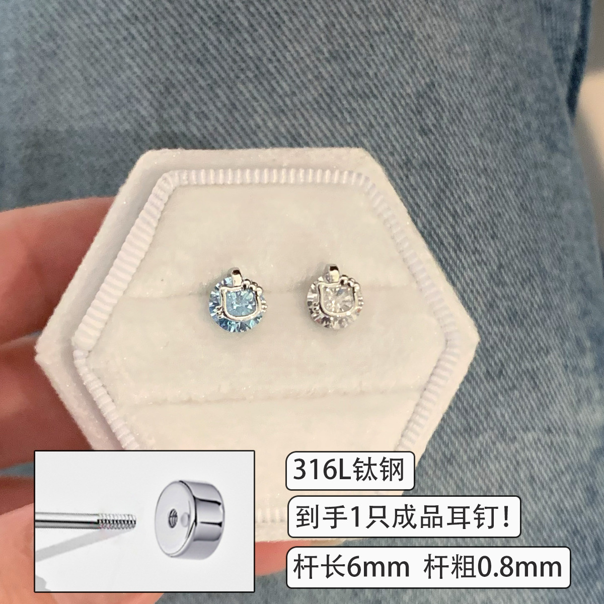 316L医用钛钢耳钉甜酷浅海蓝爱心锆石耳钉养耳洞小恶魔翅膀耳骨钉