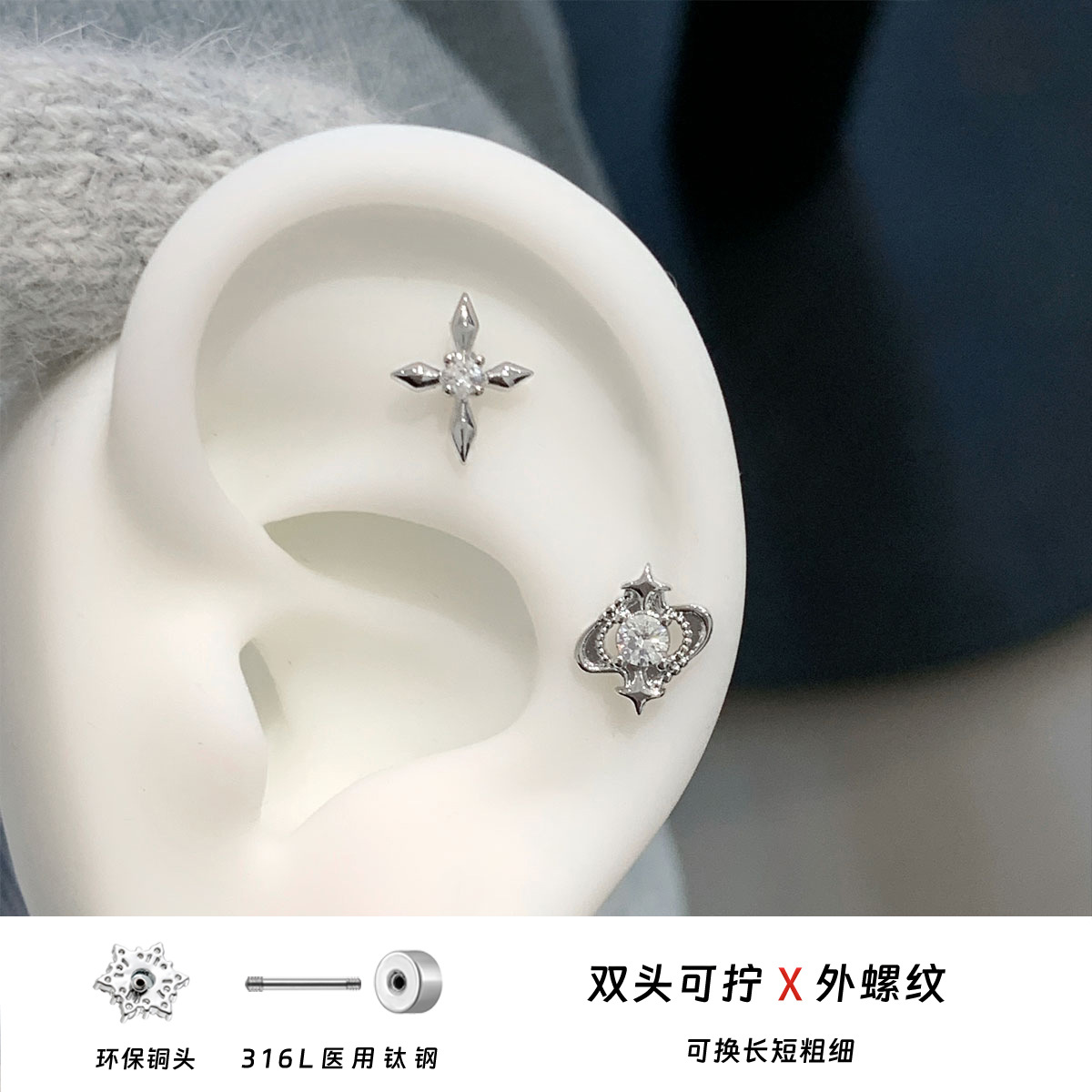 316L医用钛钢耳饰百搭十字星锆石耳骨钉精致宇宙行星星环耳蜗钉