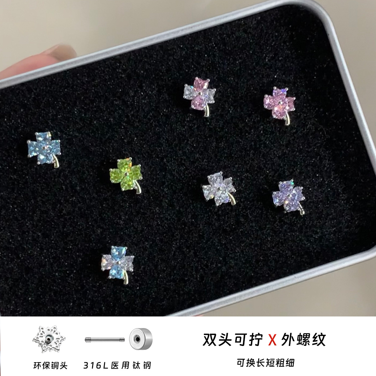 316L医用钛钢耳钉小众高级感爱心四叶草耳骨钉爆闪锆石耳蜗钉