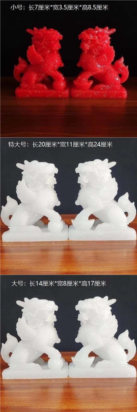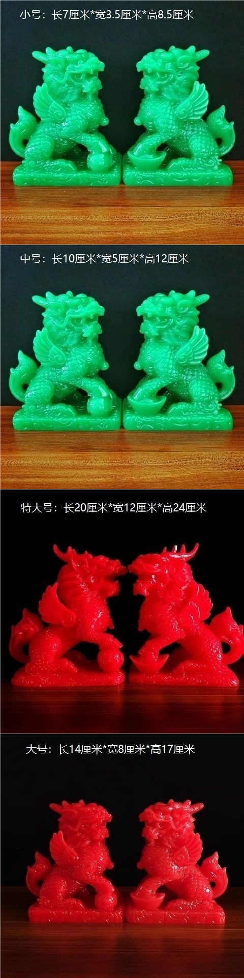颜色 小号绿玉麒麟一对长7宽4高8.5厘米,中号绿玉麒麟一对长11宽6高12厘米,大绿麒麟一对长13宽7.5高16厘米,特大绿麒麟一对长20宽11高23厘米,小号白玉麒麟一对长7宽4高8.5厘米,中号白玉麒麟一对长11宽6高12厘米,大白麒麟一对长13宽7.5高16厘米,特大白麒麟一对长20宽11高23厘米,小号黄玉麒麟一对长7宽4高8.5厘米,中号黄玉麒麟一对长11宽6高12厘米,大黄麒麟一对长13宽7.5高16厘米,特大黄麒麟一对长20宽11高23厘米,小号红玉麒麟一对长7宽4高8.5厘米,中号红玉麒麟一对长11宽6高12厘米,大红麒麟一对长13宽7.5高16厘米,特大红麒麟一对长20宽11高23厘米
