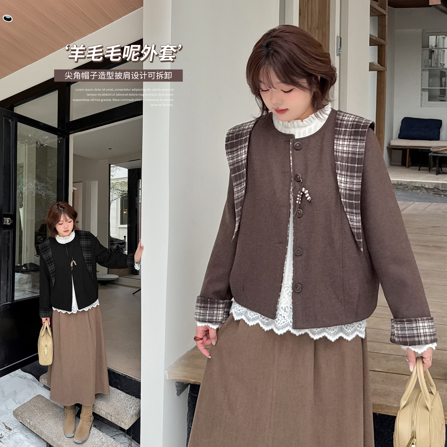 大码女装羊毛夹棉保暖毛呢外套2025冬新款披肩连帽夹克上衣413797
