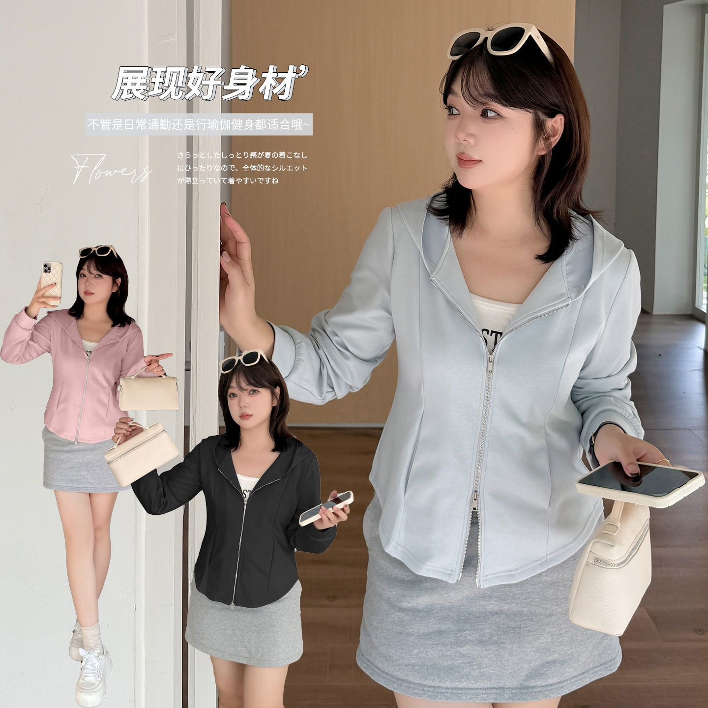 伊诺大码女装2025秋季新款纯色连帽卫衣外套女拉链插兜上衣333102
