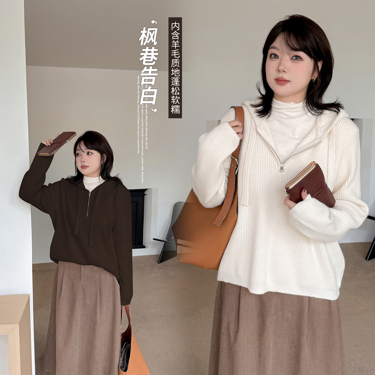 伊诺大码女装羊毛连帽毛衣2025秋冬新款半拉链直筒显瘦上衣343342