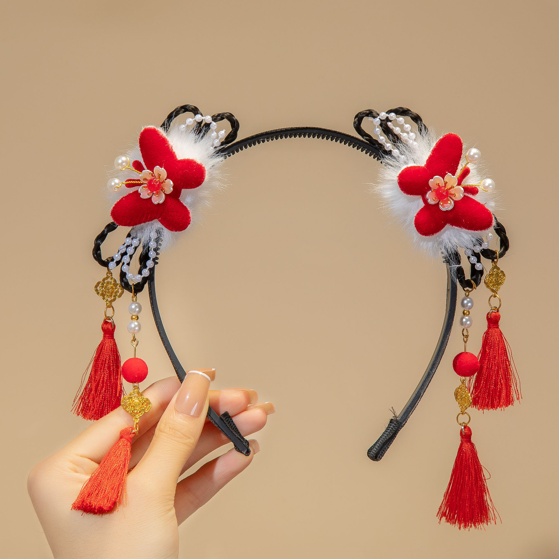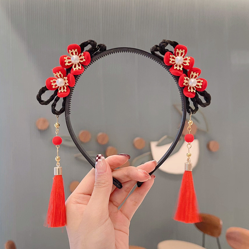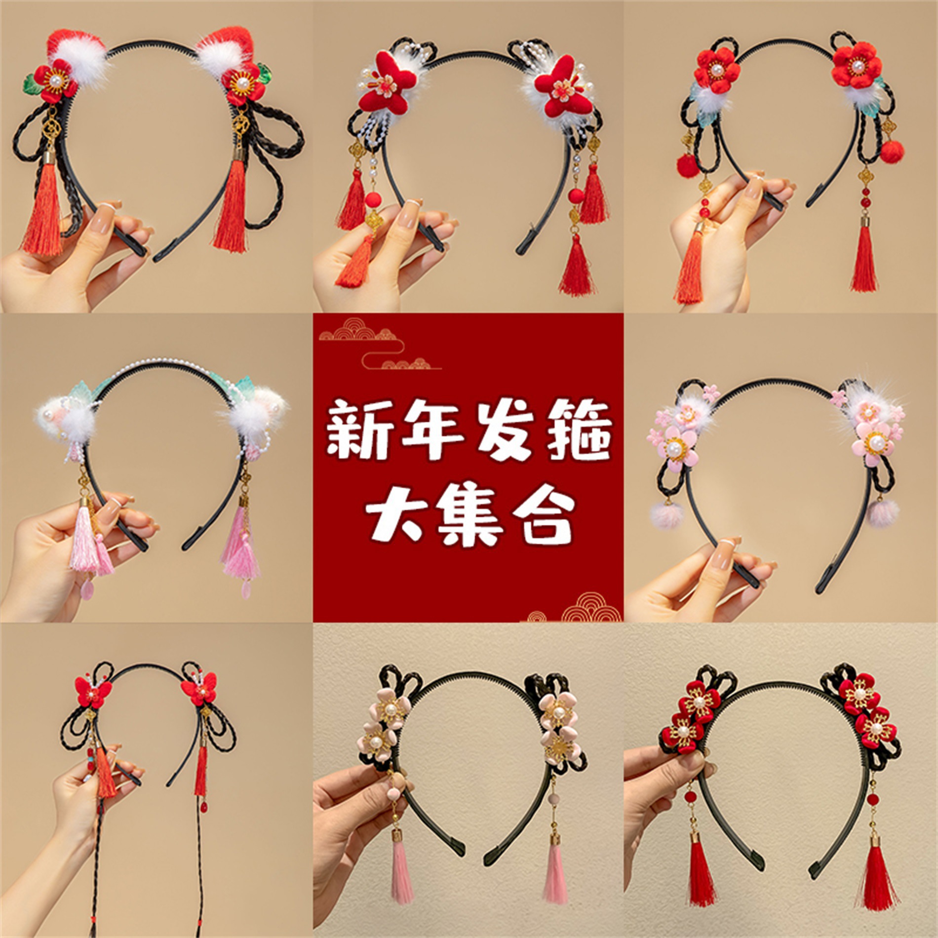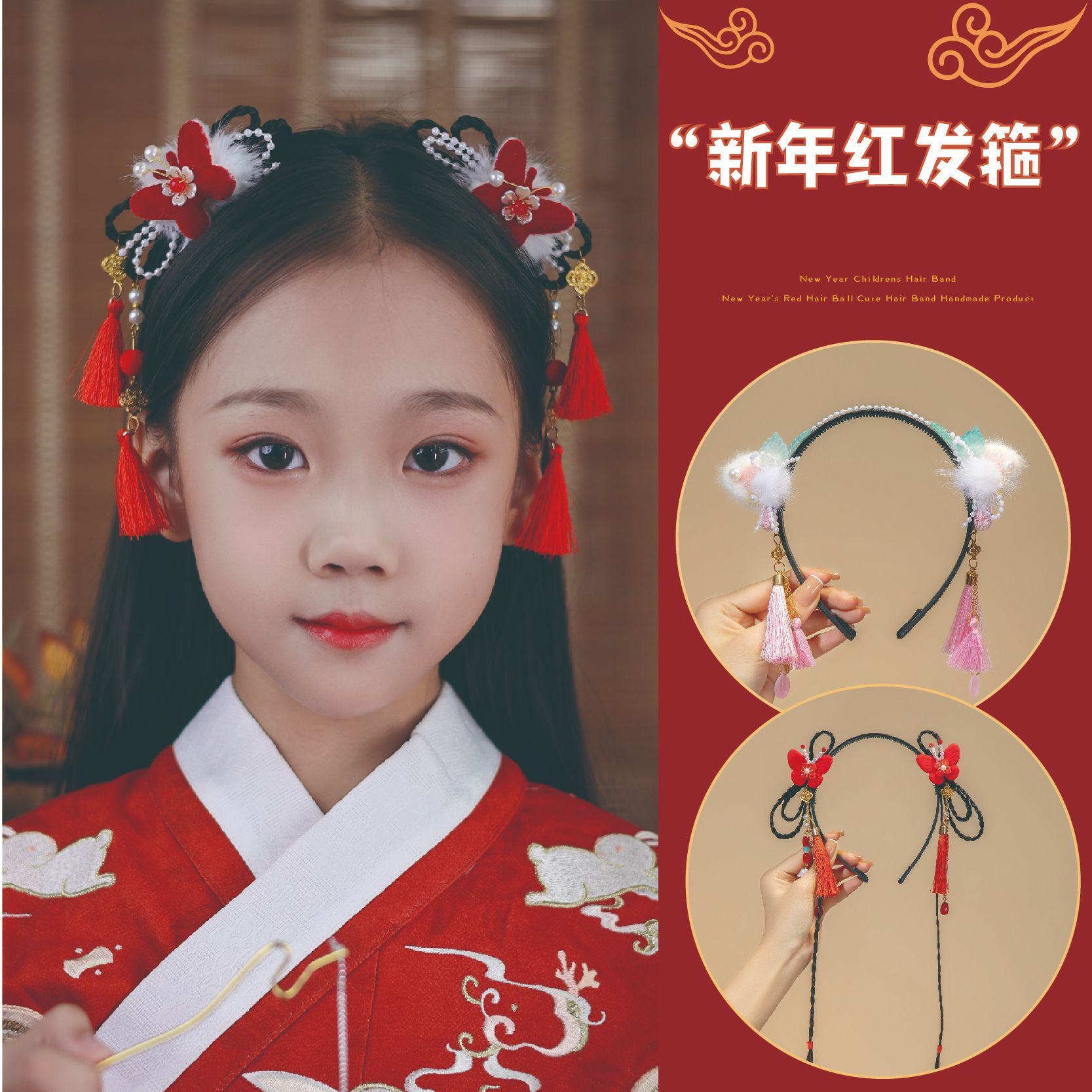 新年红色儿童古装头饰流苏头箍中国古风发箍毛球花朵女童过年发饰