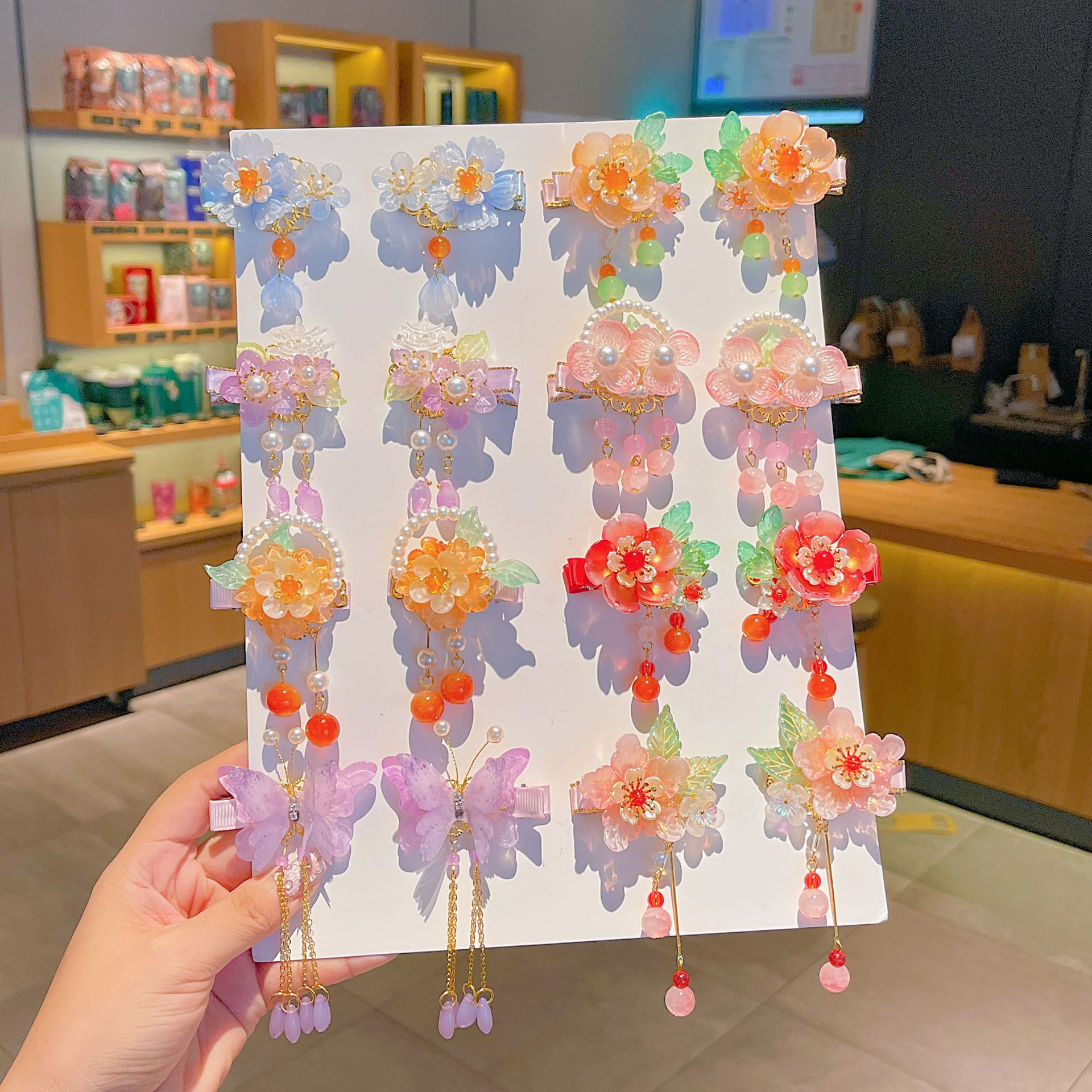 子供用漢服中国風ヘアピン、女の子用古風ヘアピン、花飾り、タッセル飾り、国潮風リボン