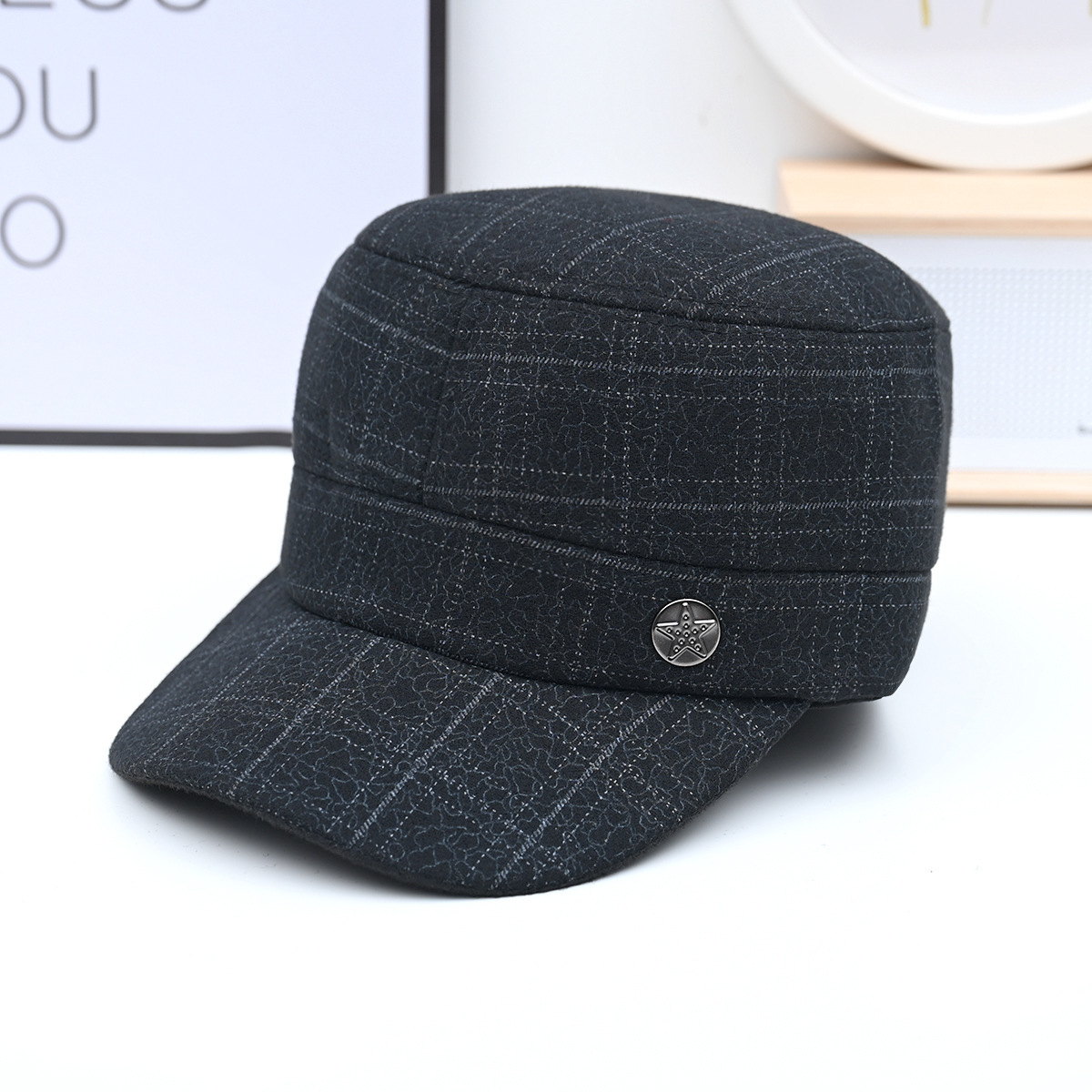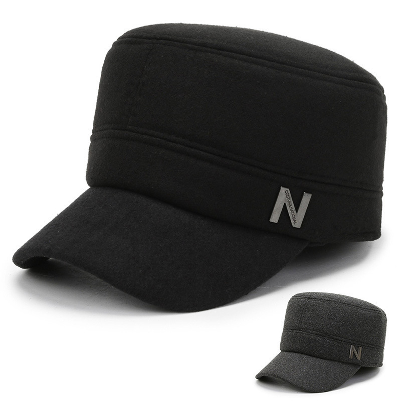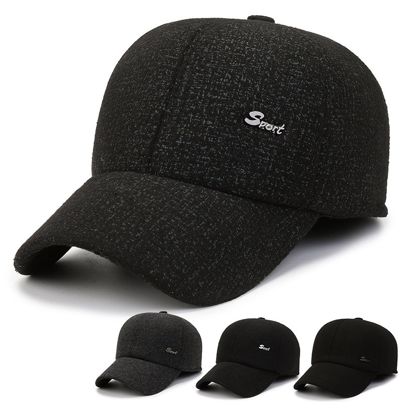 冬の新作メンズ帽子、裏起毛・厚手のウール素材、平型帽子、防風・保温・耳当て付き、お父さん向けコットン帽子
