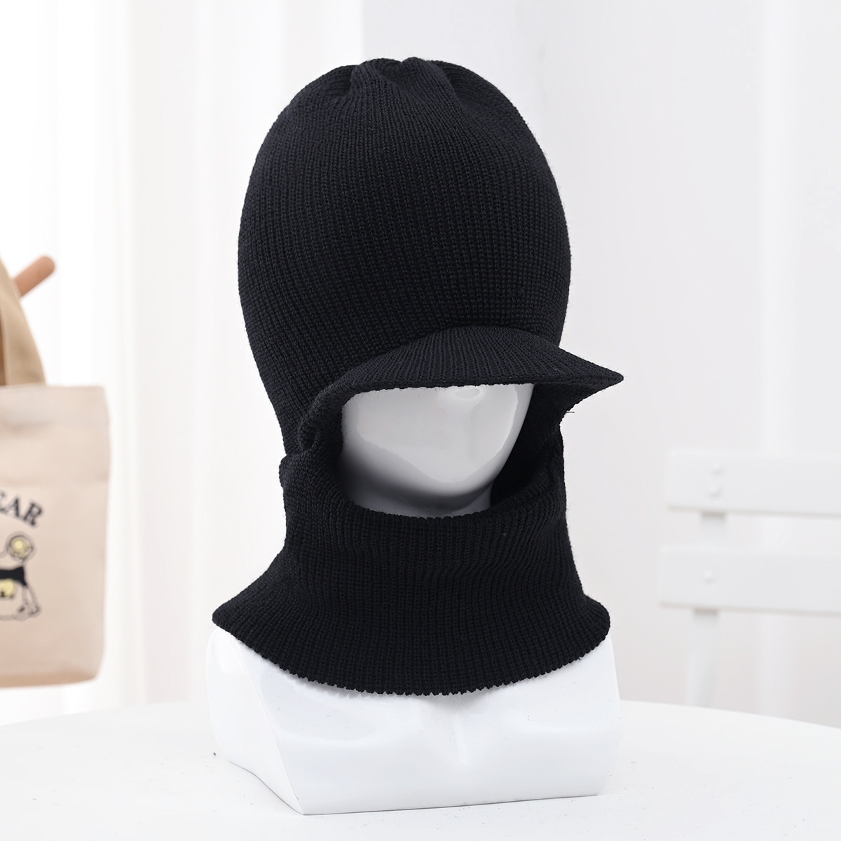 冬季带檐护耳毛线帽中老年男士老虎帽户外骑车护颈连体套头针织帽