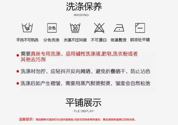 关于洗涤:深色衣物初次清洗可能会有轻微的浮色;属于正常现象哦;洗涤时务必与浅色衣物分开清洗,所有的衣物勿用温水/开水洗涤;禁止机洗 机洗摩擦力太强 禁止浸泡 轻柔手洗。