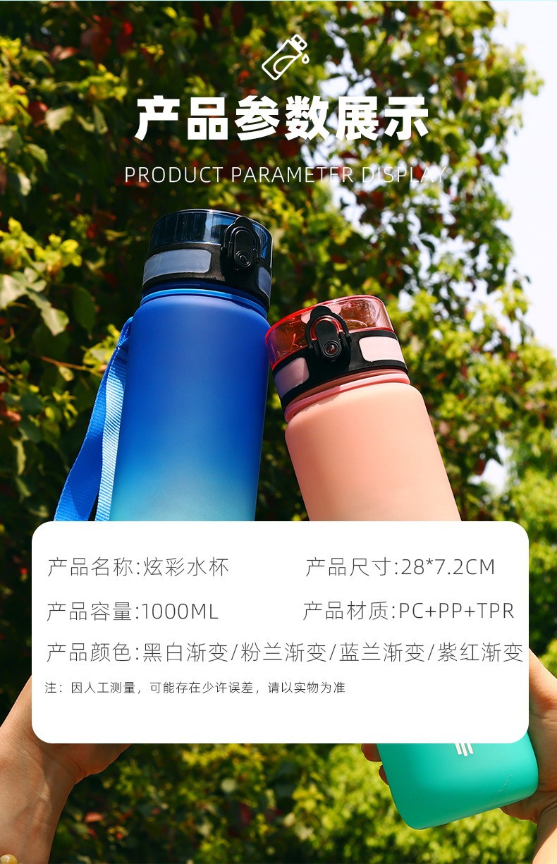 亚马逊大容量高颜值便携1000ml夏运动炫彩太空杯塑料刻度水壶杯子