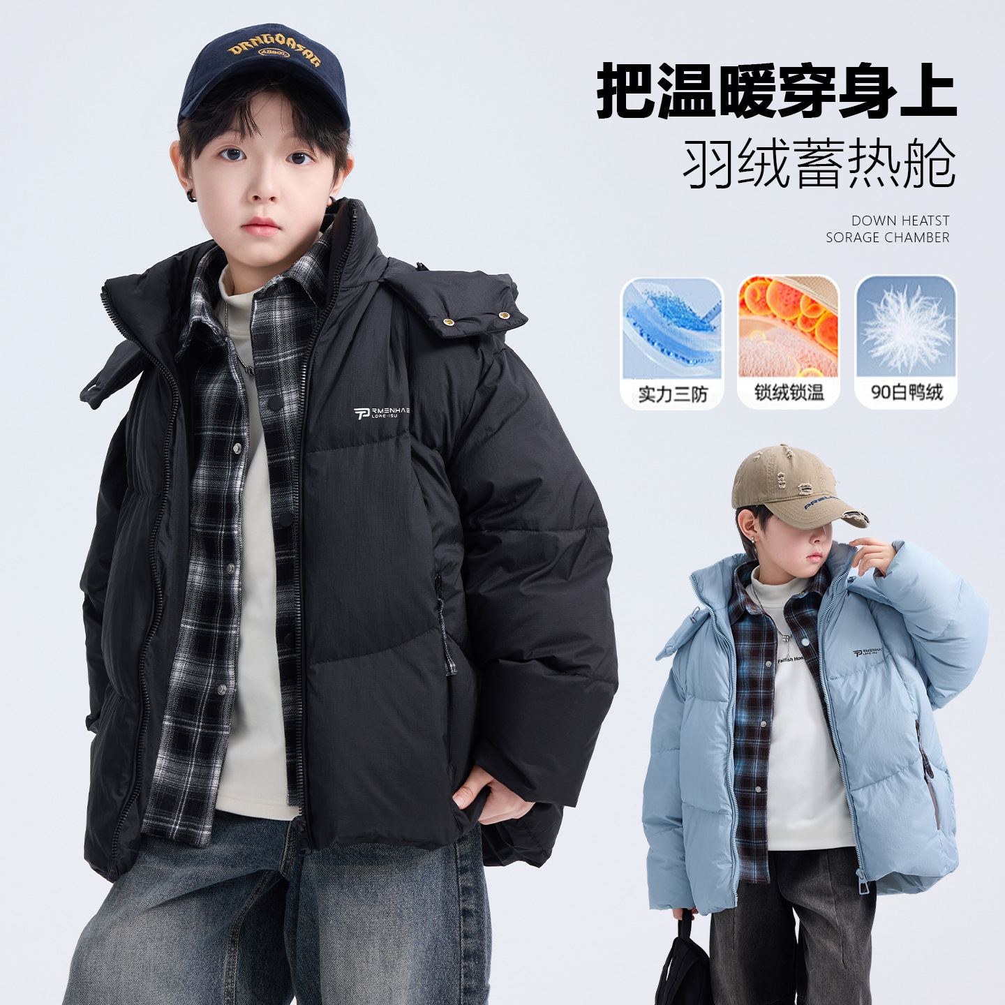 男童洋气假两件羽绒服2025冬装新款大童韩版90白鸭绒防寒户外外套