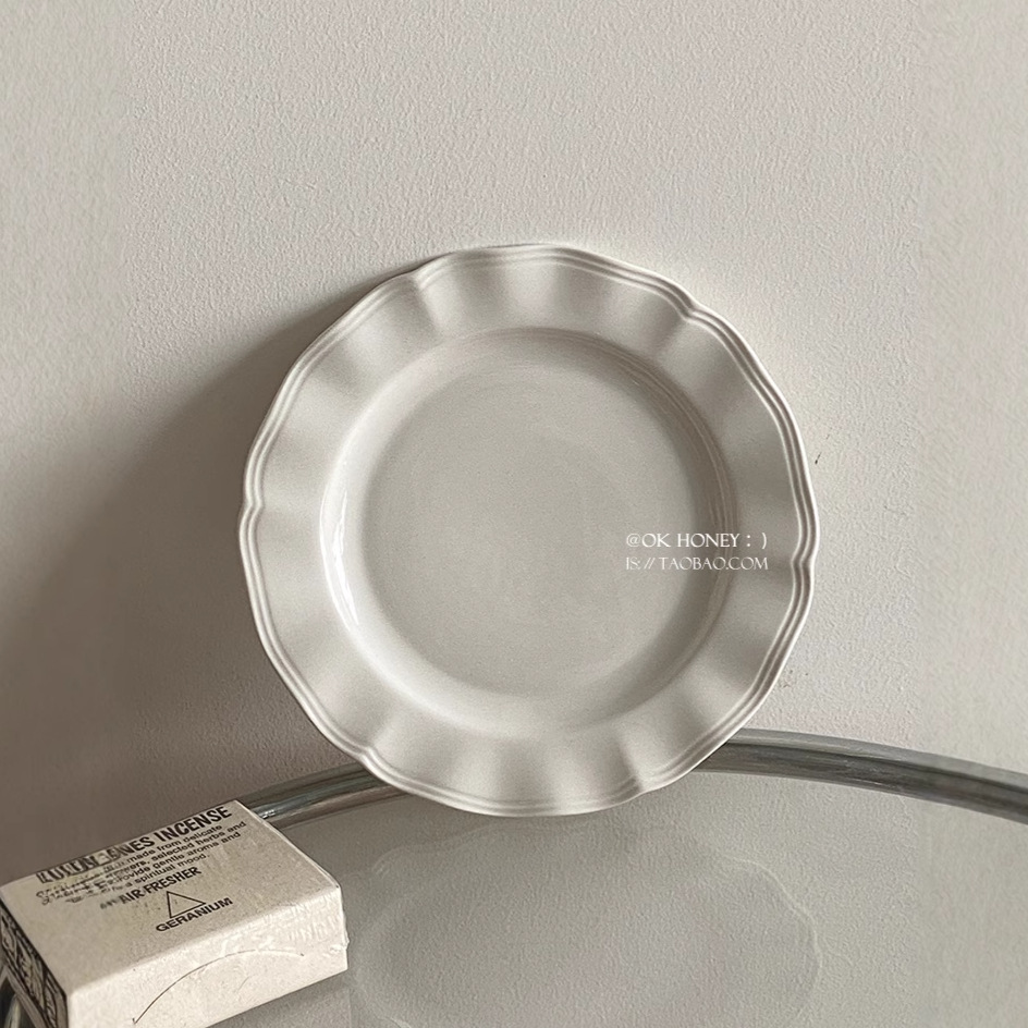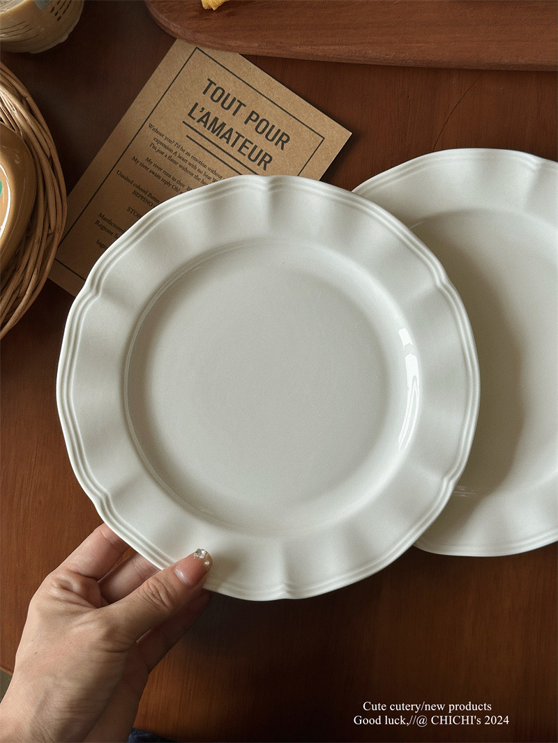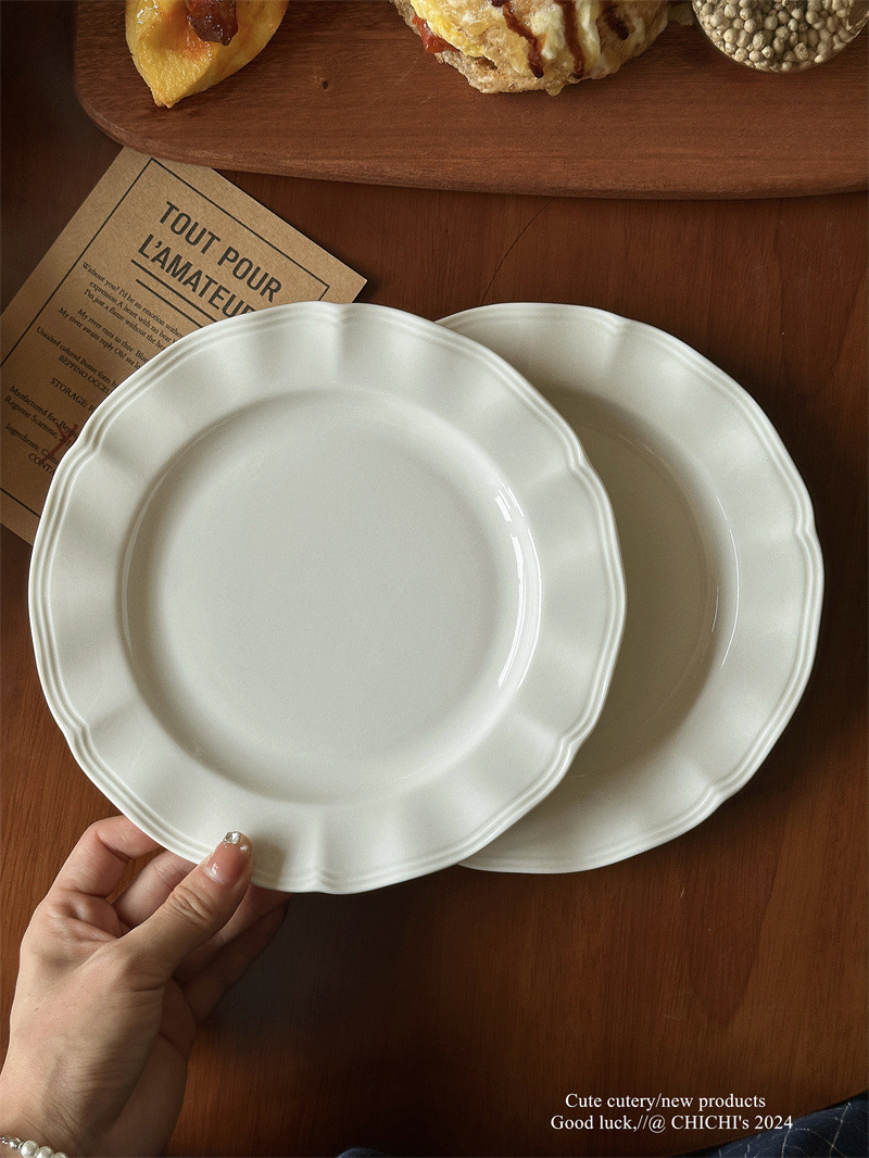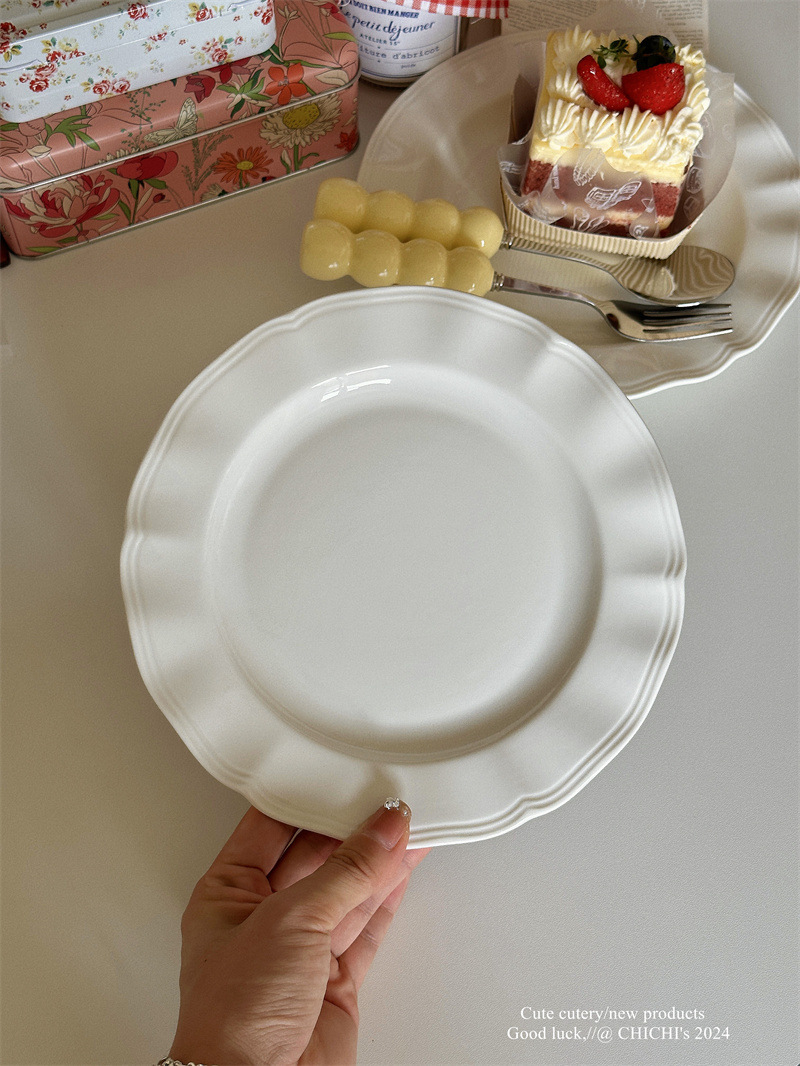 インスタ風レトロレリーフラインレースプレート純白セラミックプレートフレンチレリーフサイド洋食プレートデザート朝食皿