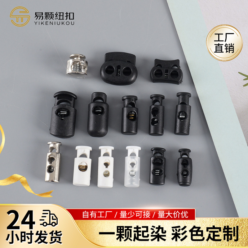 ソースメーカーのプラスチックボタンカスタマイズされた黒と白の円筒形二穴豚鼻バックル滑り止め弾性ロープ調節可能なスプリングバックル