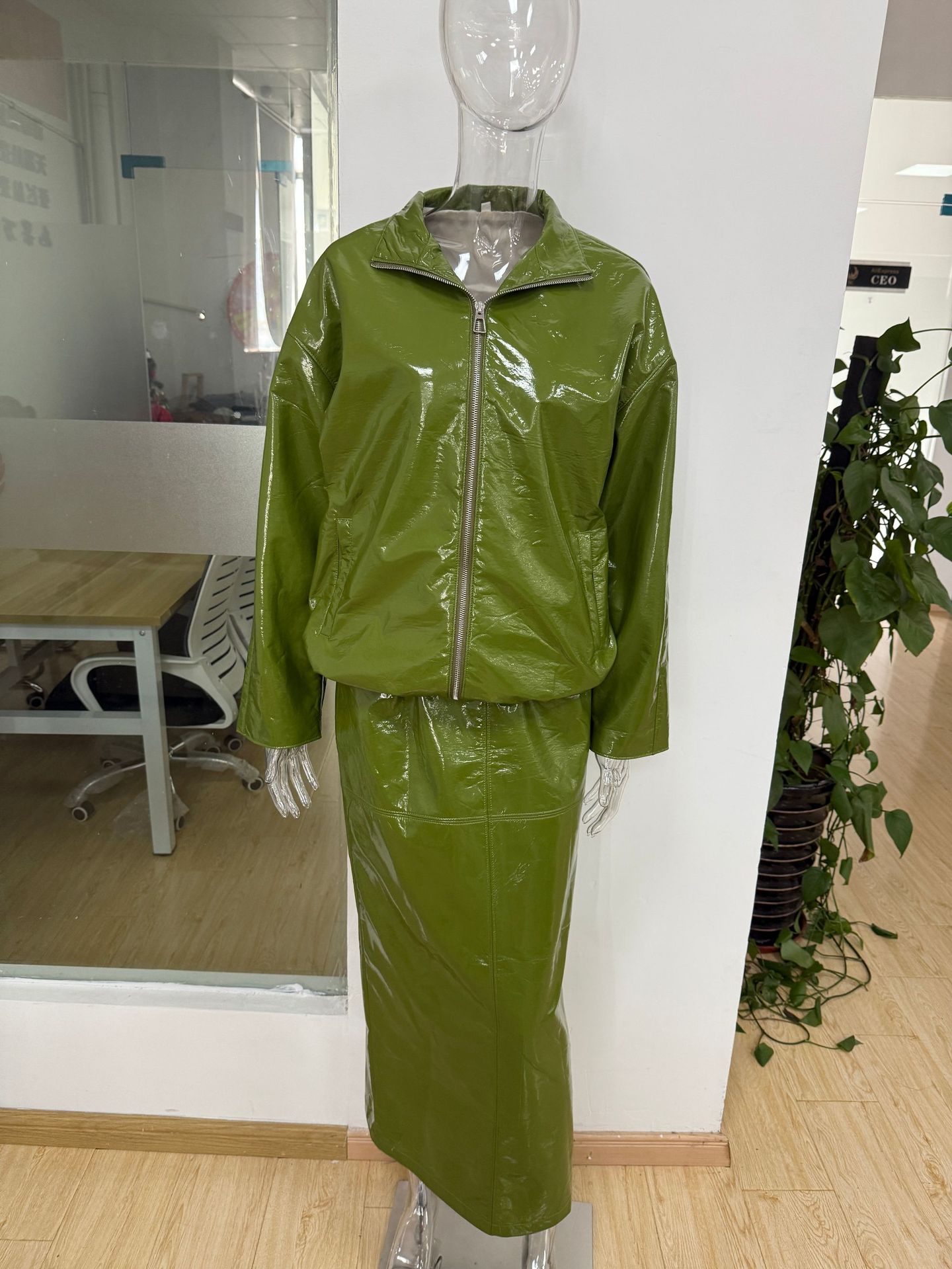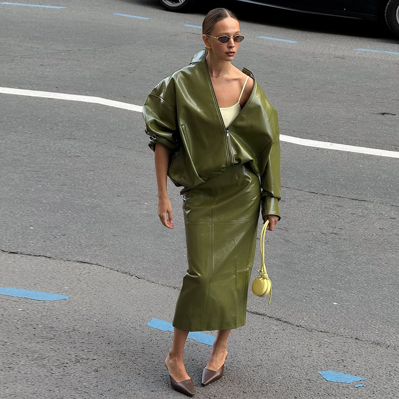 2025秋季新款欧美亚马逊跨境外贸女装拉链长袖绿色气质通勤皮套装