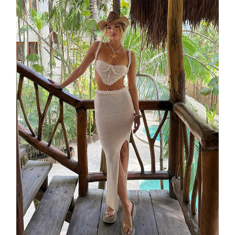 アマゾン欧米クロスボーダー2025春新作カジュアルリゾート風透かし編みビーチスカートセット2点セット