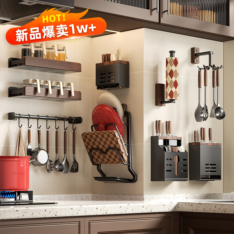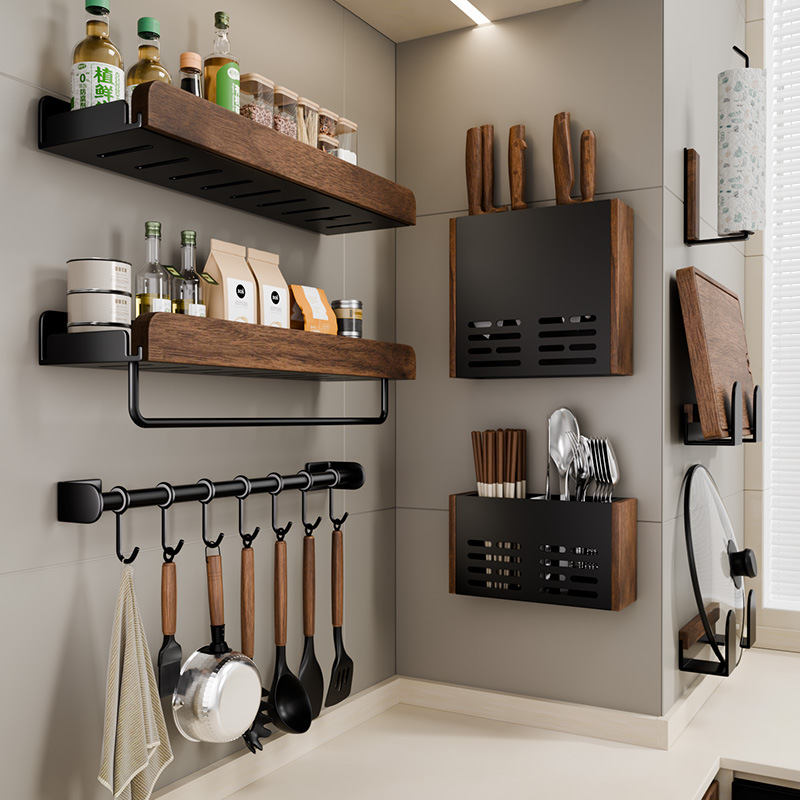 胡桃木厨房多功能置物架中古风免打孔壁挂多层调料品菜板刀收纳架