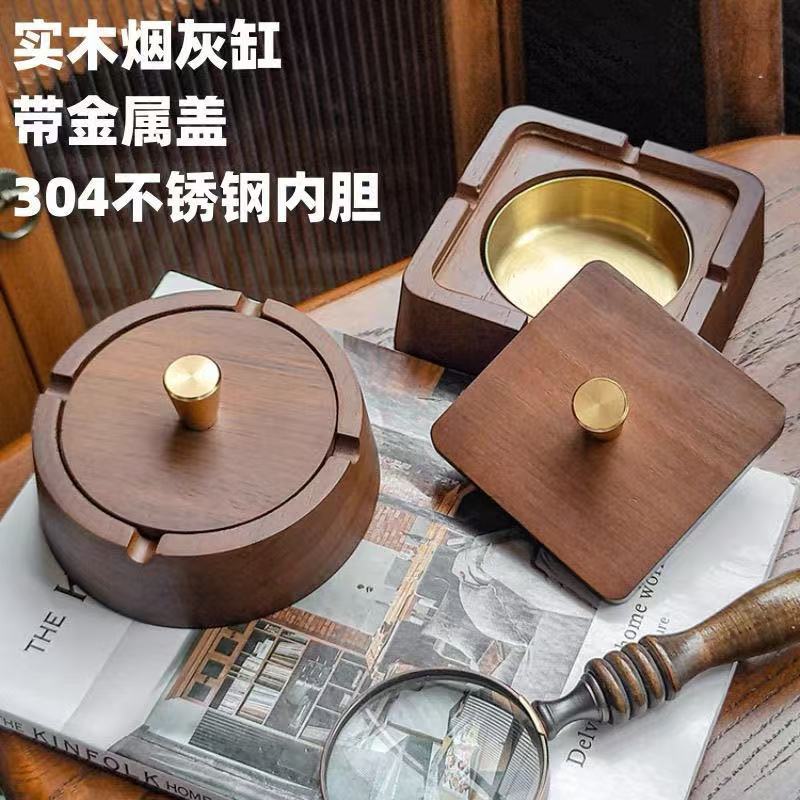 胡桃木烟灰缸家用客厅带盖防飞灰不锈钢内胆创意办公室品质烟灰缸