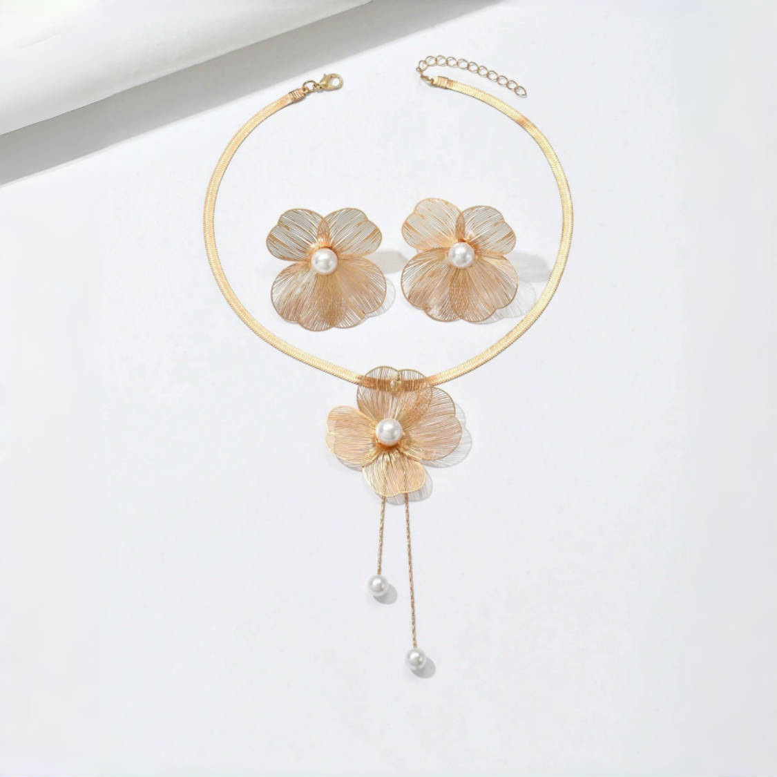欧米風クロスボーダーネックレスイヤリングセット、万能な花柄パールデザイン、個性的なロング鎖骨チェーンジュエリー(女性用)