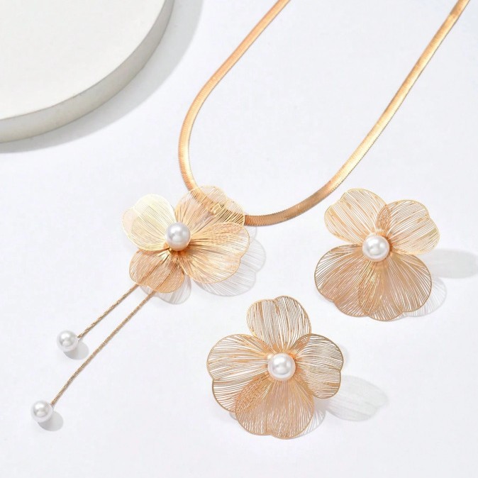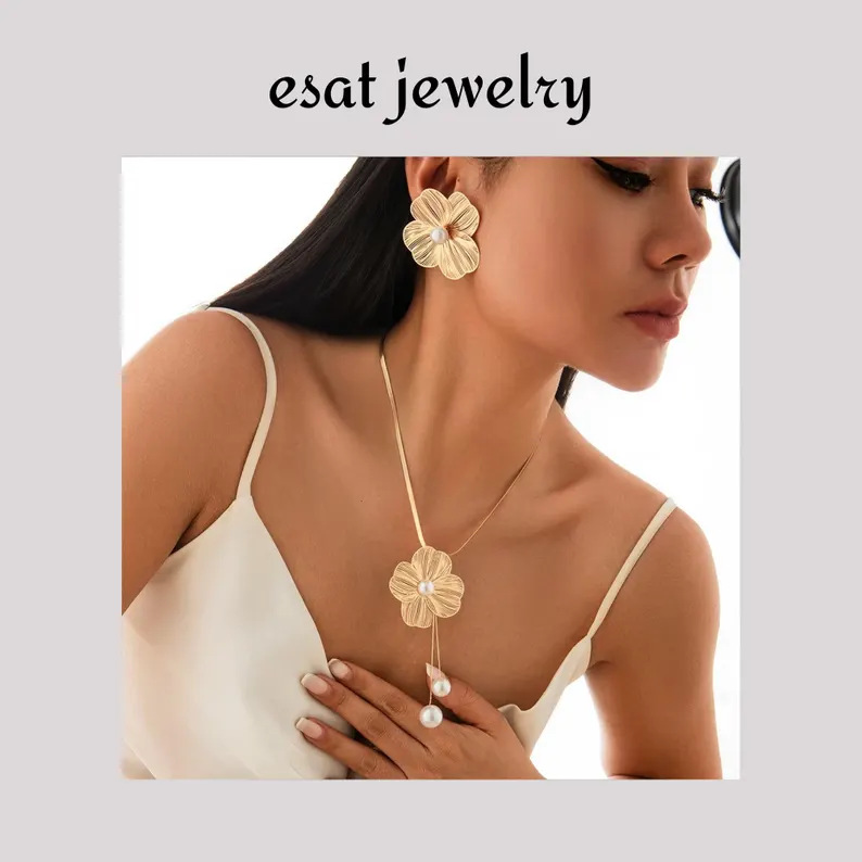 跨境新款金色仿珍珠花朵耳环复古时尚气质高级感铜片项链套装夸张