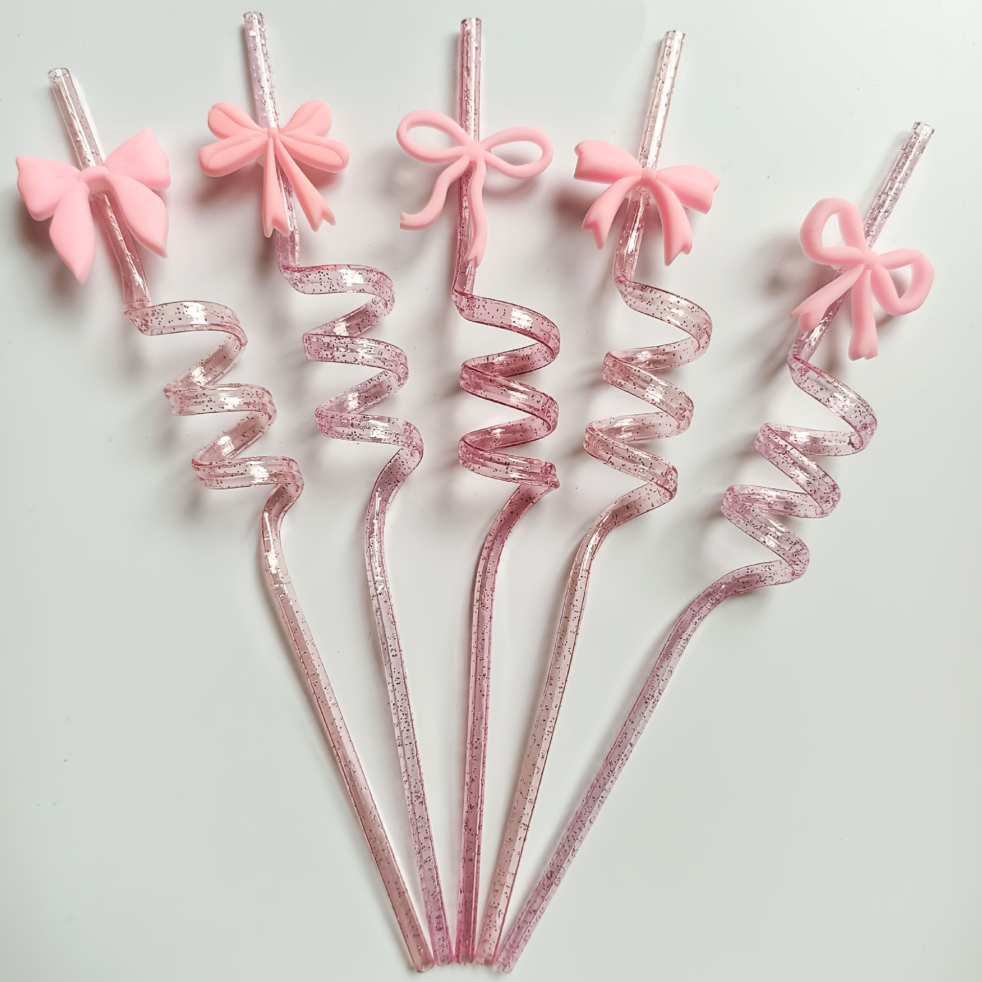 亚马逊跨境热销粉色蝴蝶结吸管主题派对造型PETG螺旋闪亮吸管批发