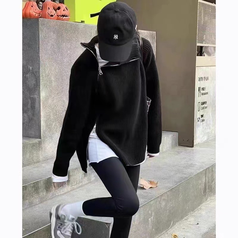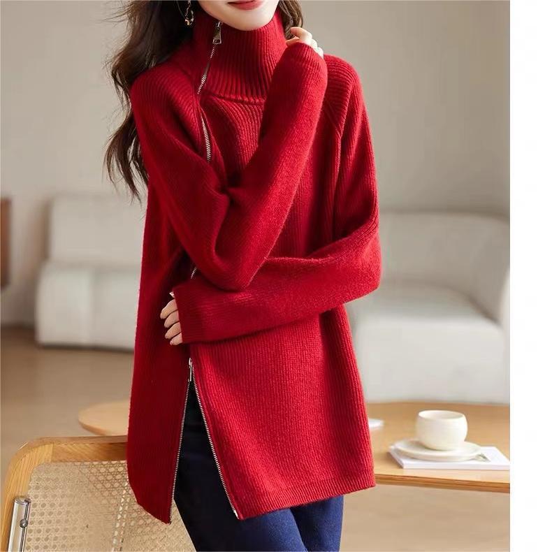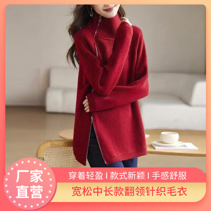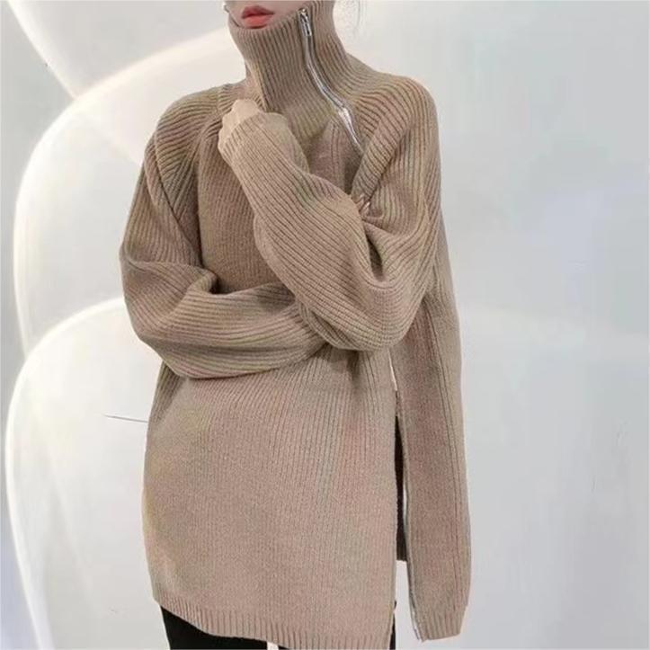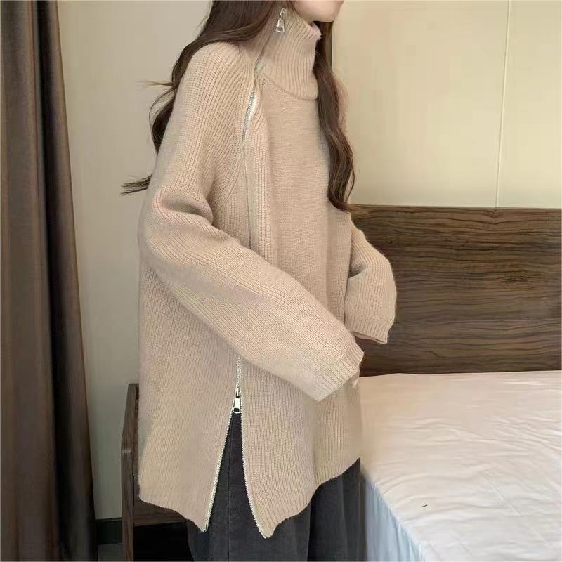 2025新款宽松中长款慵懒风侧拉链翻领针织衫女秋冬女裝开衫毛衣女