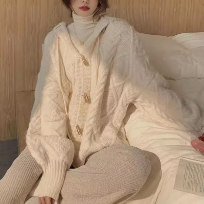 2025 日本のレトロなフード付きホーンボタンニットカーディガン女性の秋と冬の新しい気質ルーズで多用途なセータージャケット