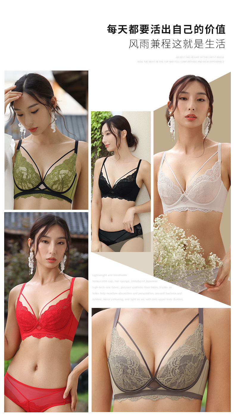 女士蕾丝内衣大胸显小调整型聚拢文胸软钢圈收副乳防下垂胸罩套装
