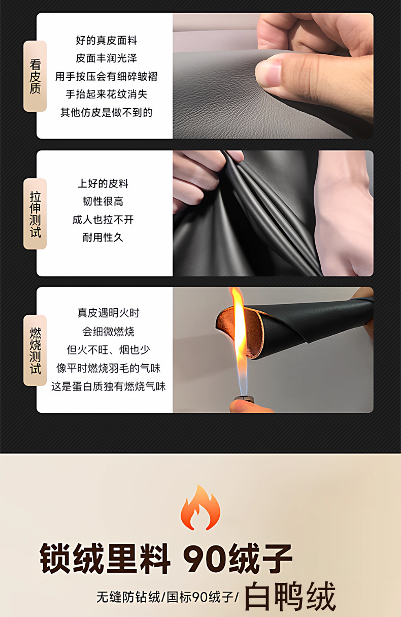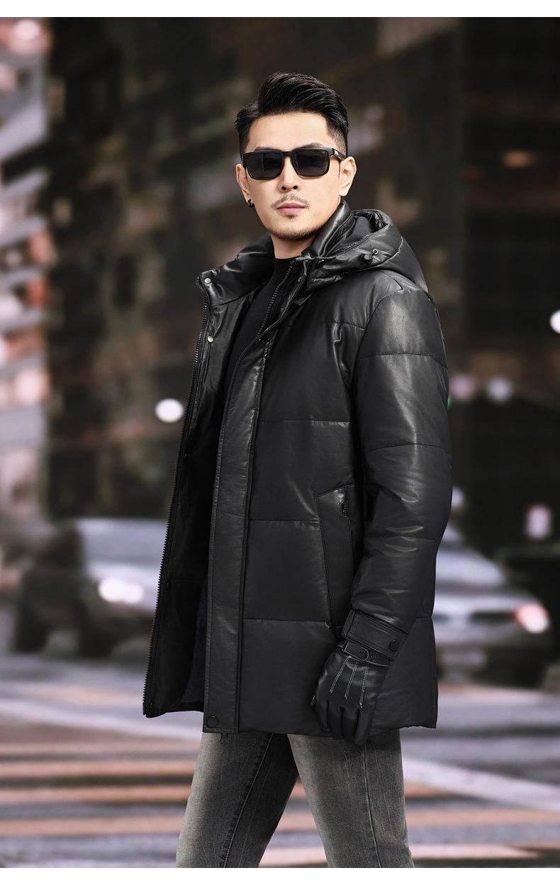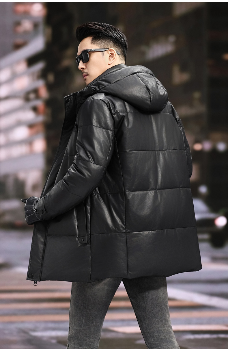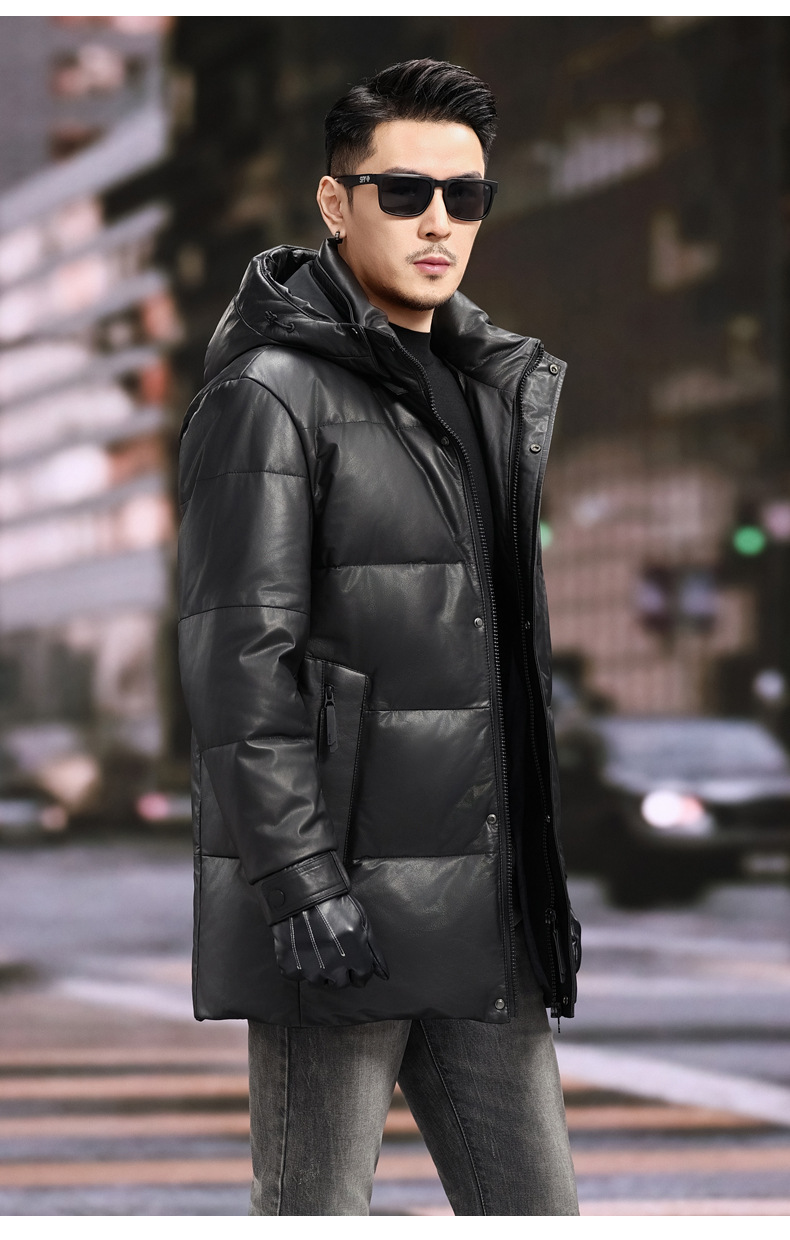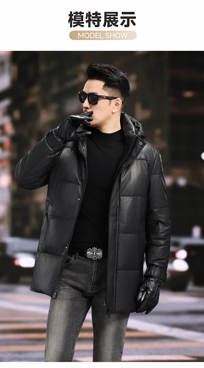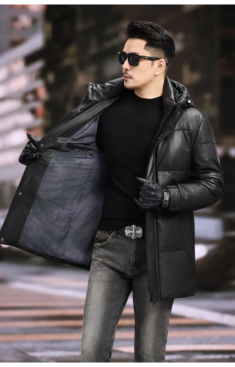 2025新款头层小牛皮真皮羽绒服男中长款羽绒皮衣连帽保暖厚外套