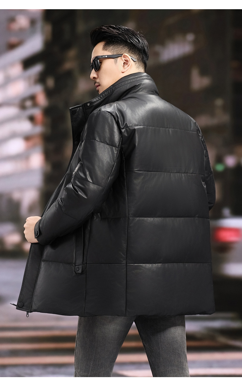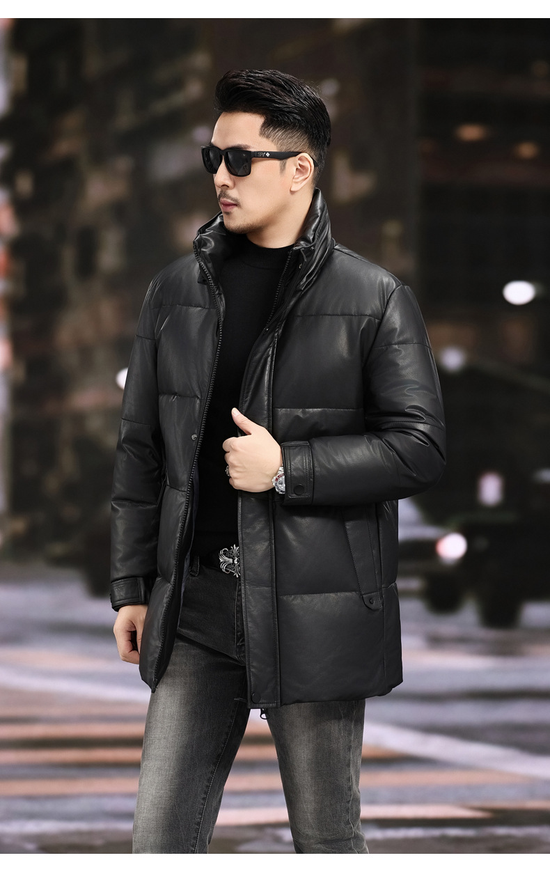 2026年海寧産本革メンズ羊革ダウンジャケット、スタンドカラー、トレンディなミドル丈、スリムフィット、裏起毛レザージャケット