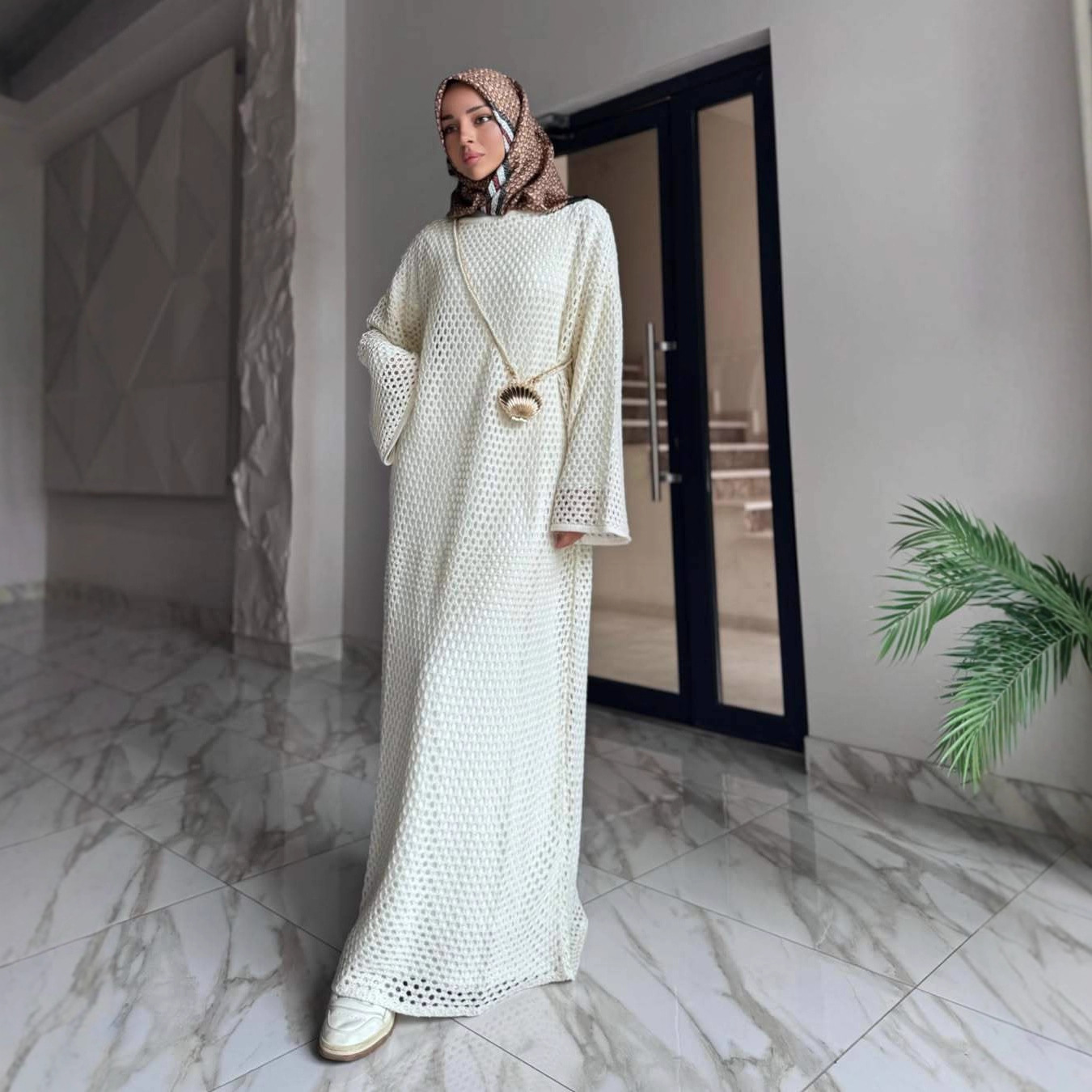 中東クロスボーダーロングスカート 2025 夏の新ファッションカジュアルルーズ無地長袖気質ターバンドドレススーツ