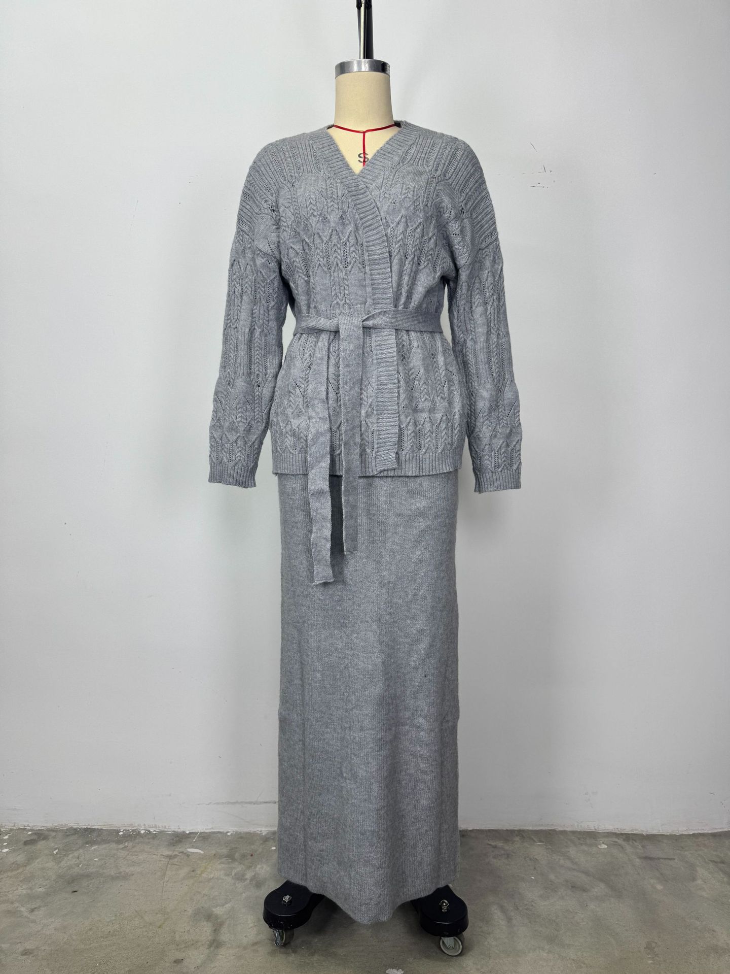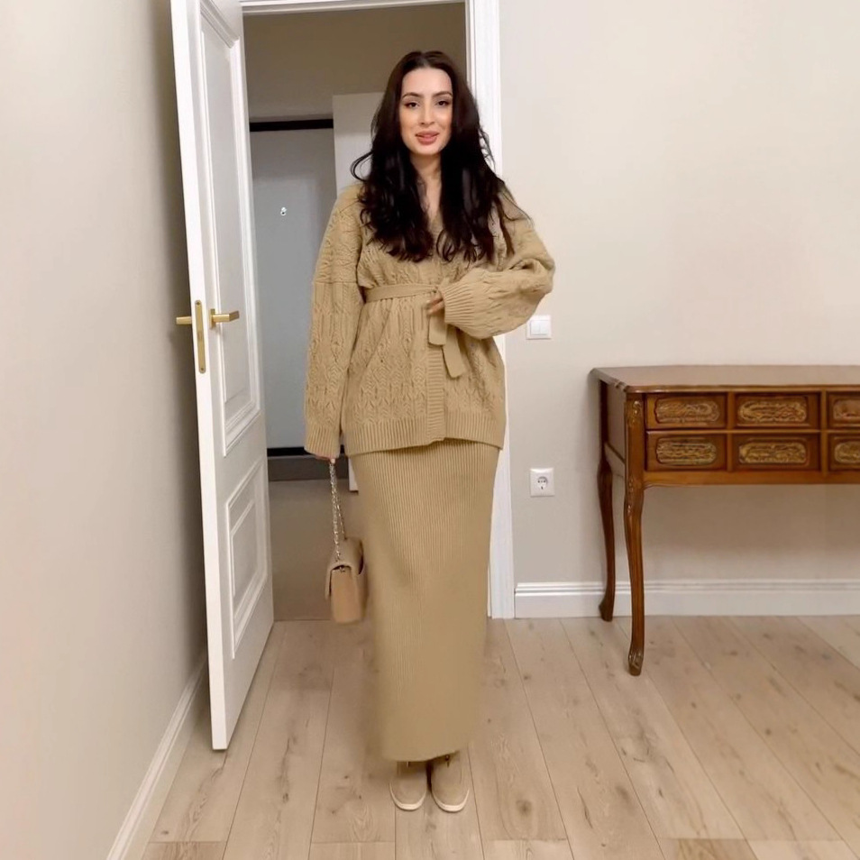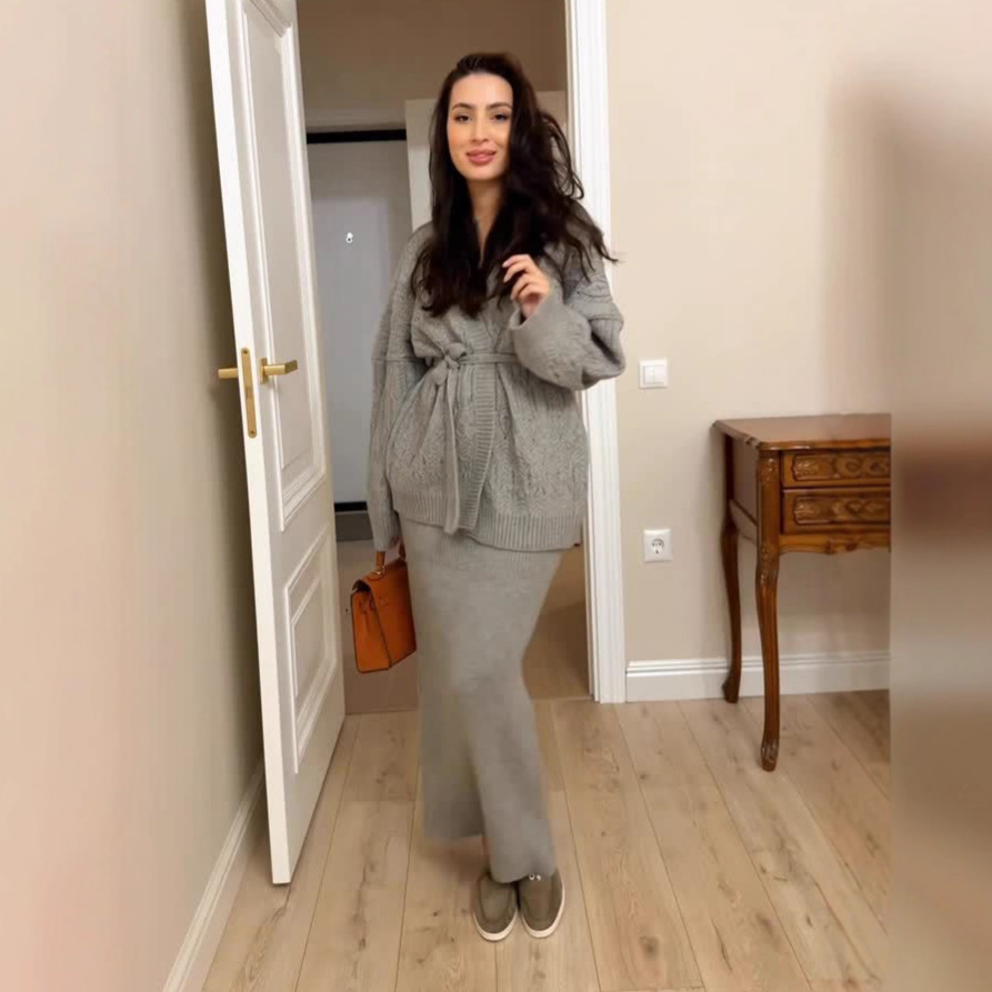 欧美跨境女装长裙2025秋季新款居家休闲针织开衫外套毛衣包臀裙