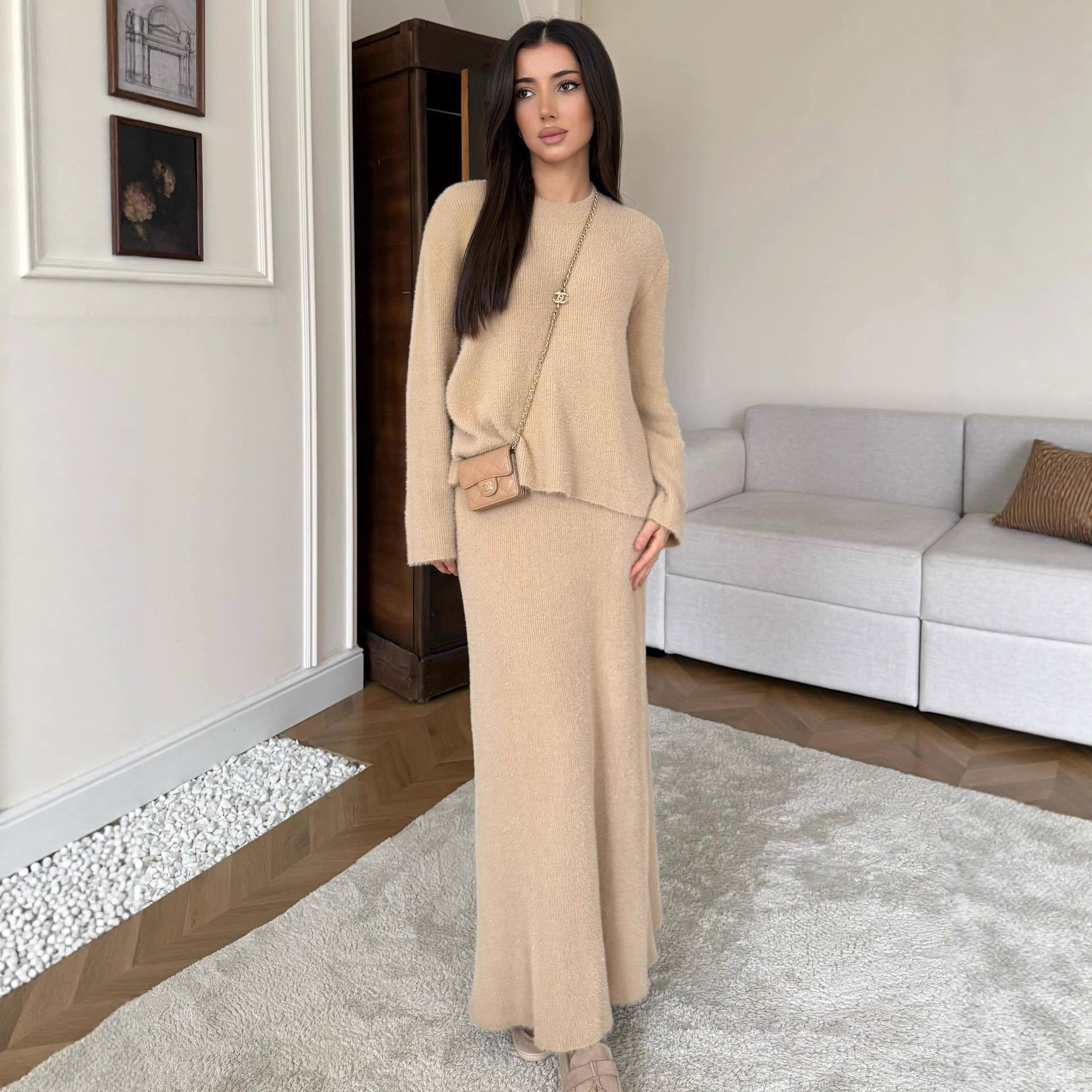 欧美跨境女装2025秋季新款软糯休闲圆领长袖毛衣宽松针织包臀裙