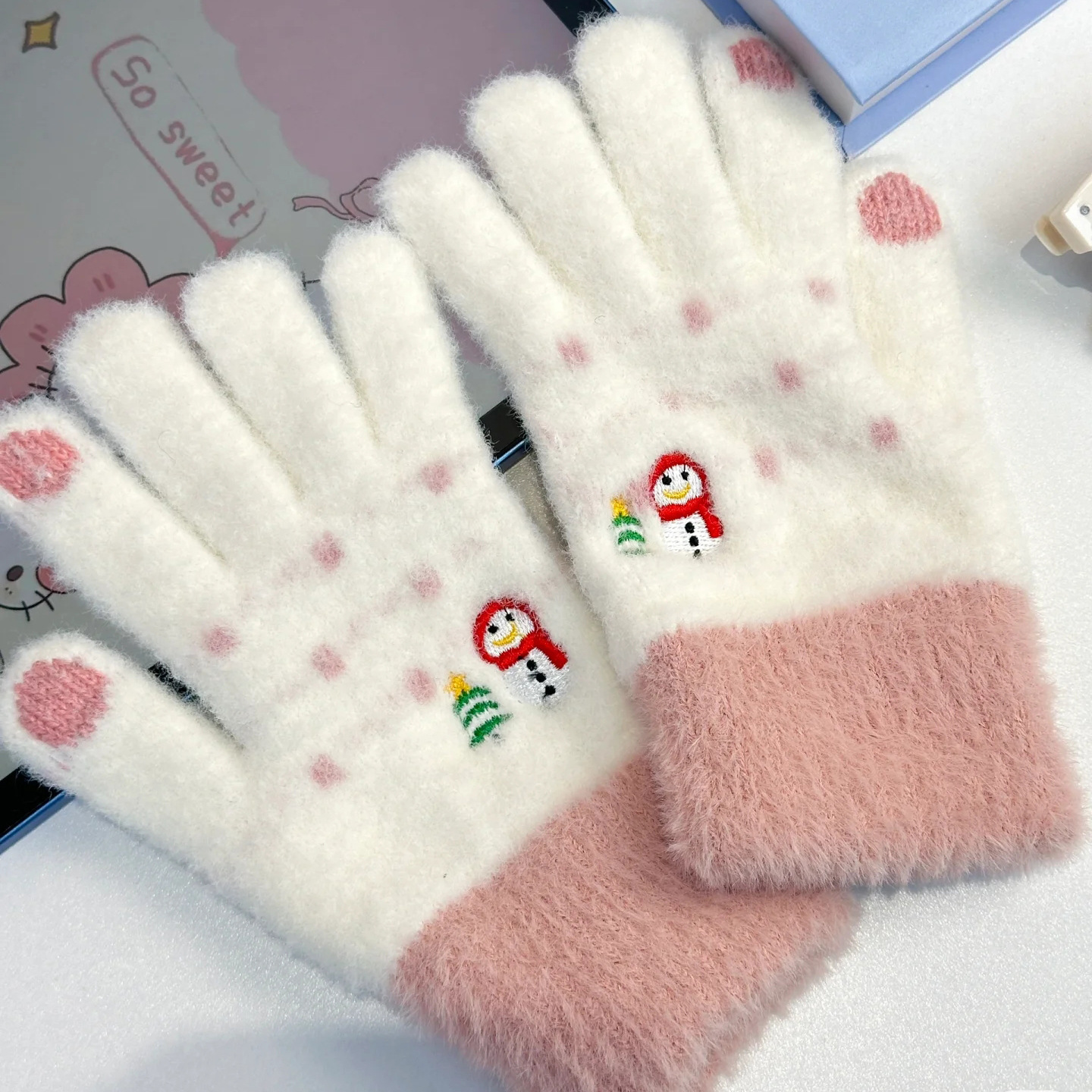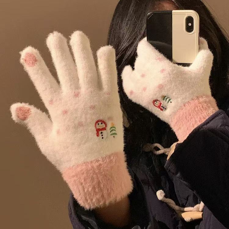 韩版可触屏圣诞氛围感可爱雪人刺绣毛绒手套女款冬季加绒保暖手套