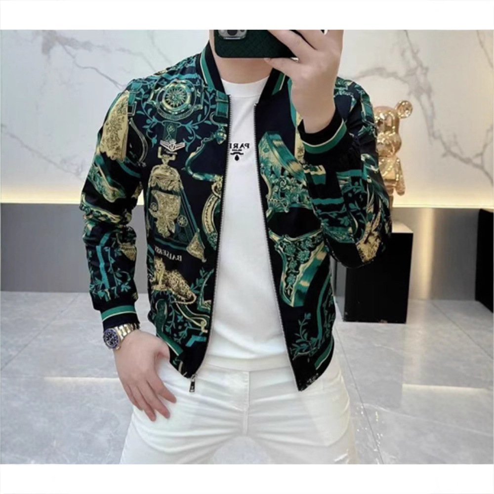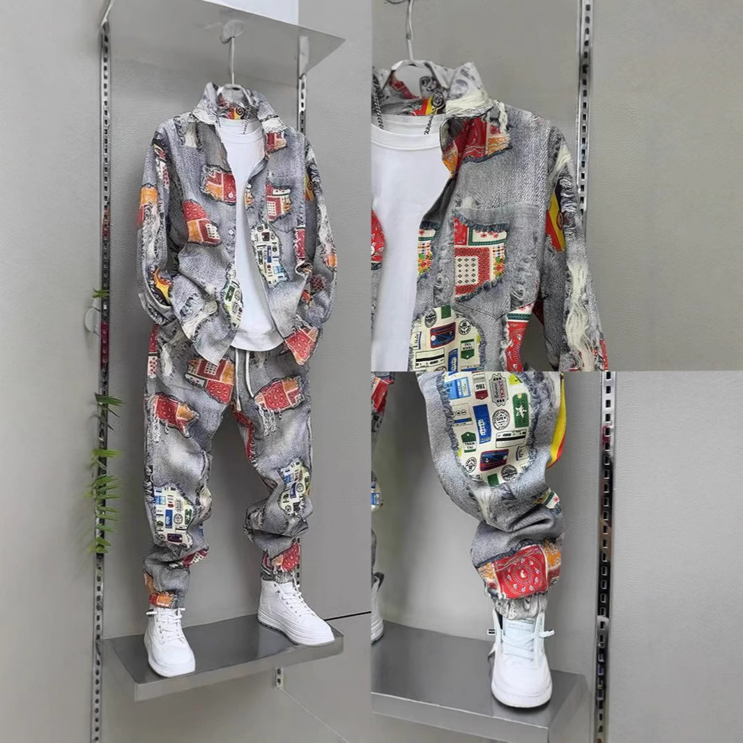 2025 春と秋の新メンズプリントスーツカジュアルジャケットとズボンレトロ塗装香港スタイルツーピースファッションセット