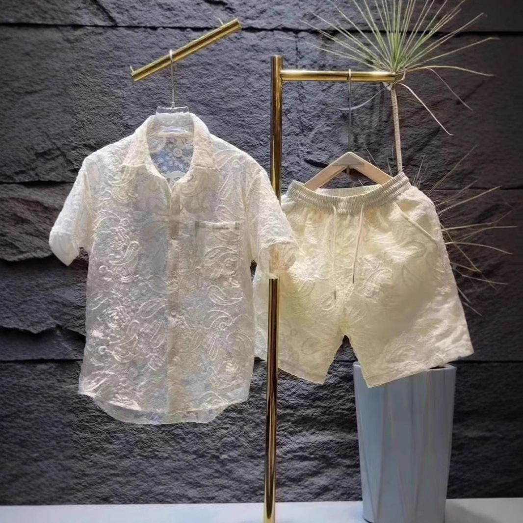 2025 夏人気アメリカンスタイル中空刺繍カジュアルシャツ半袖薄いメッシュショーツスーツメンズファッション