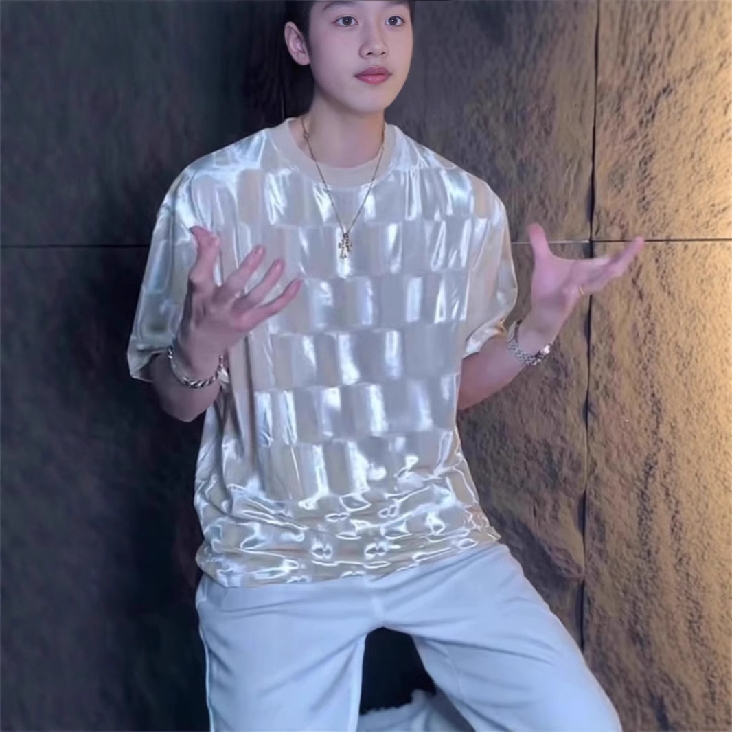 韓国風のファッショナブルな光沢のあるレイヤードデザインメンズ半袖Tシャツライトラグジュアリーニッチアウターウェアルーズ5分袖ボトリングシャツ
