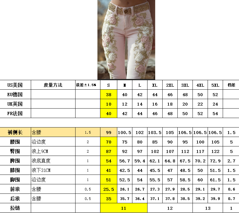 跨境2025女式复古粉红玫瑰刺绣艺术印花牛仔裤气质优雅