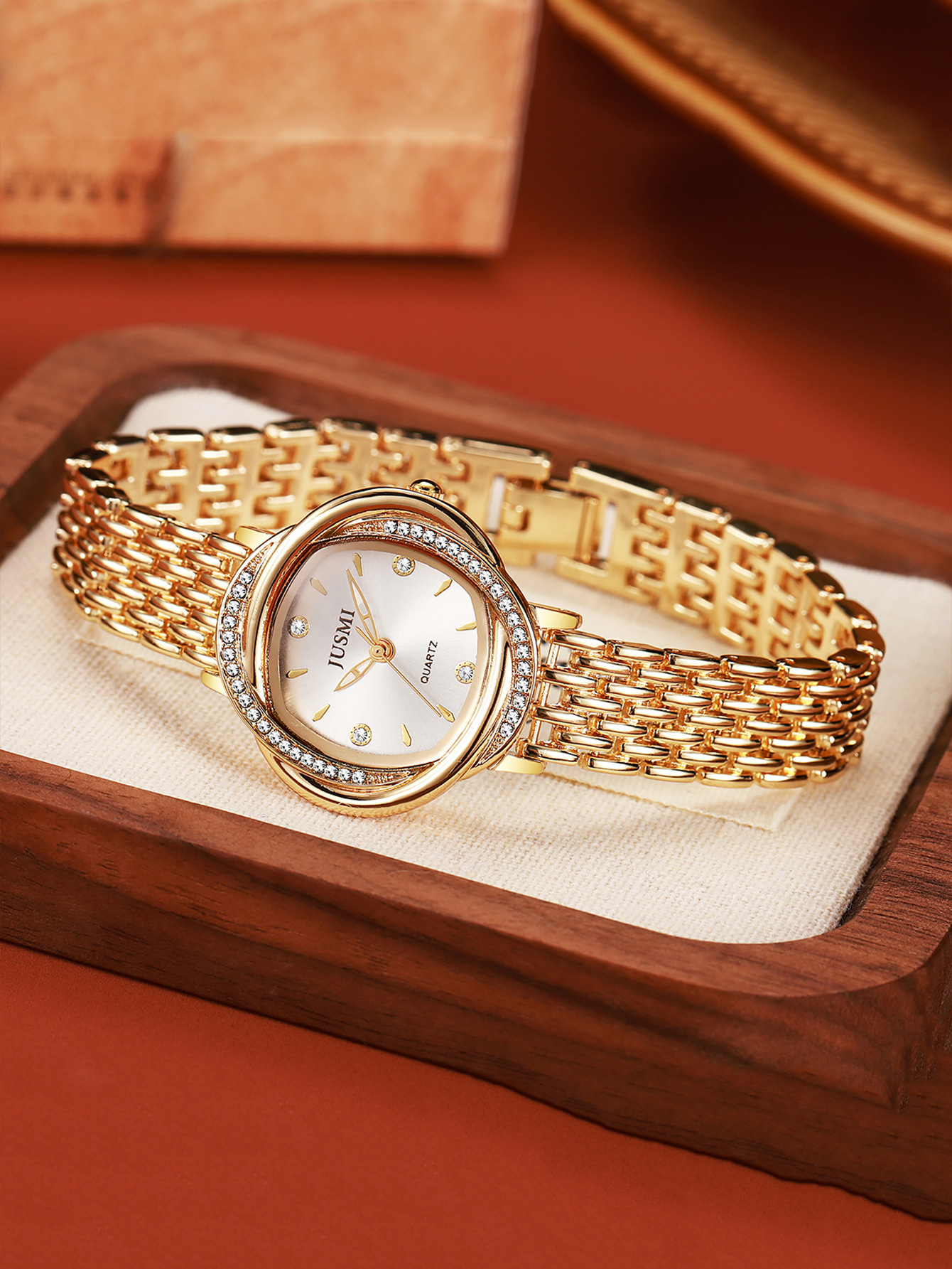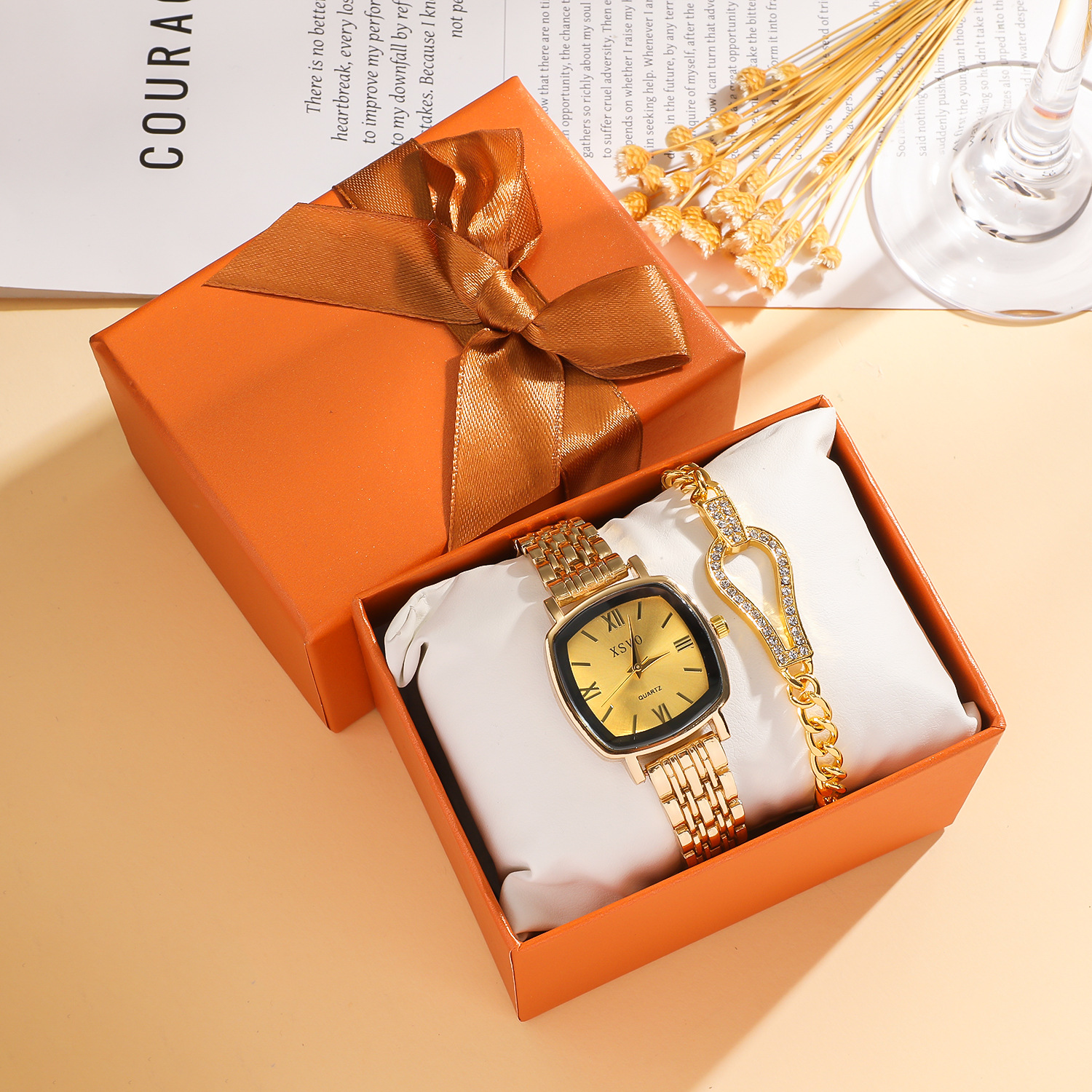 跨境新款轻奢石英女表高级感钢带手表方型表盘镶钻手链精美套装