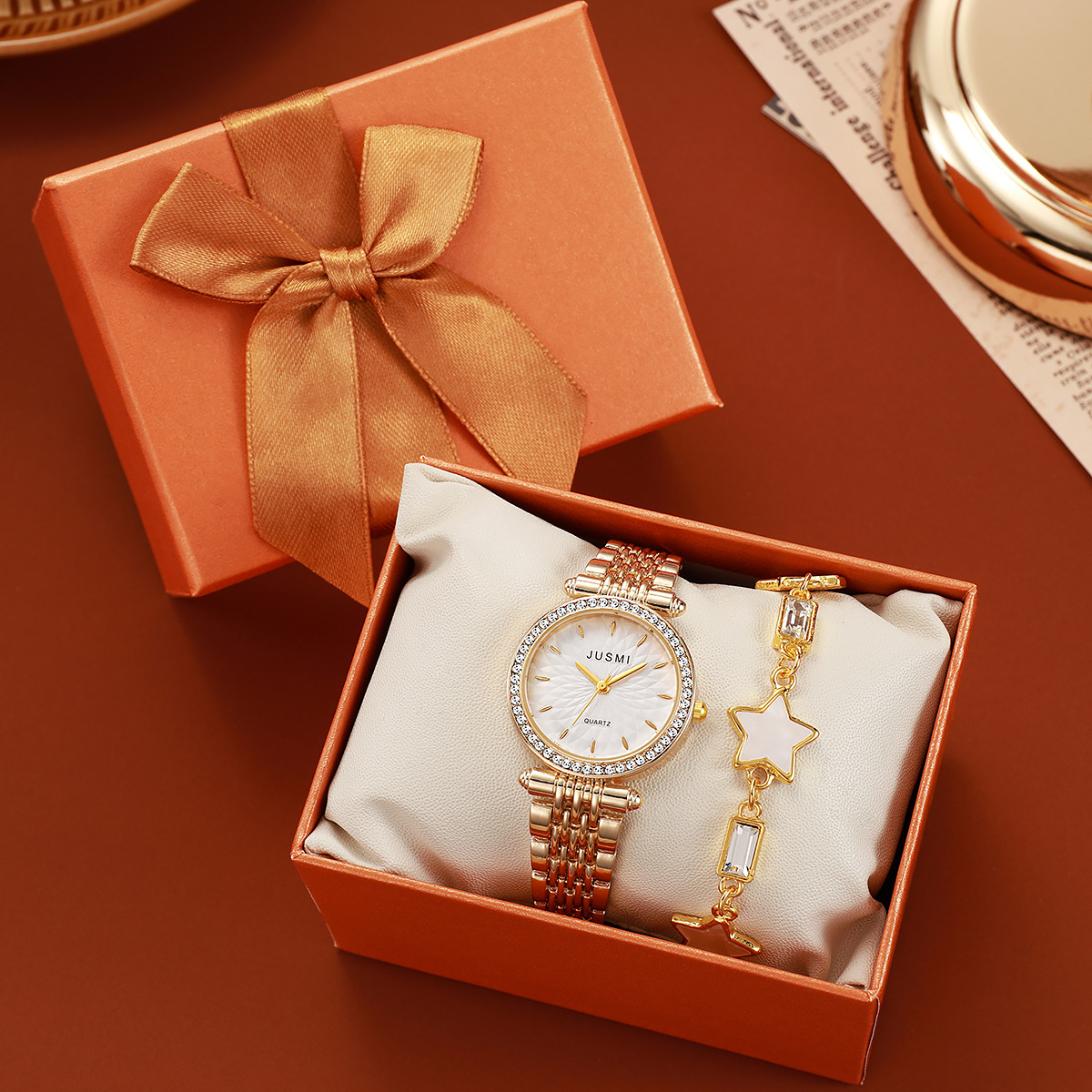 款女表小众高级感水钻表盘圆形手表女钢带腕表星星手链精美套装