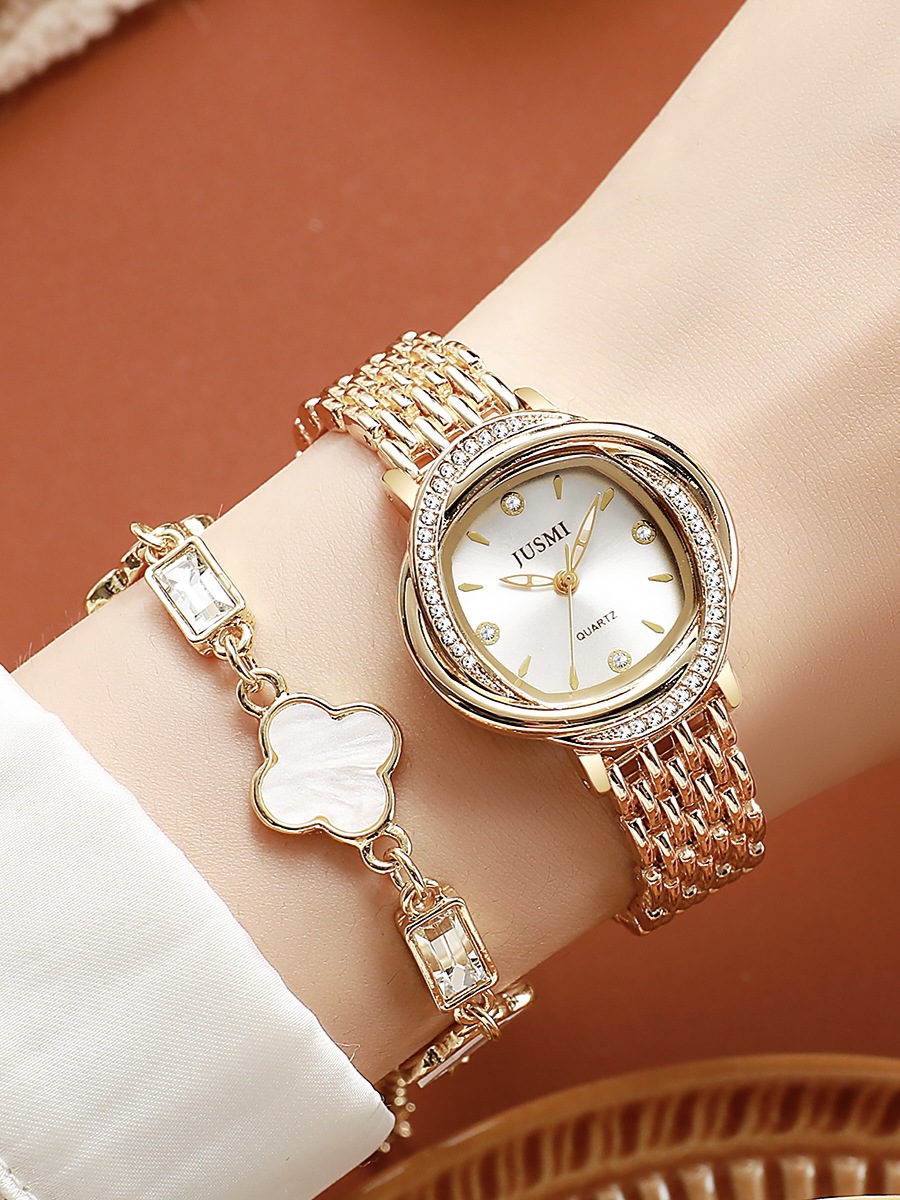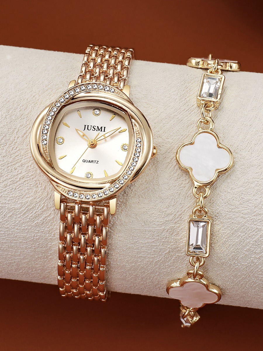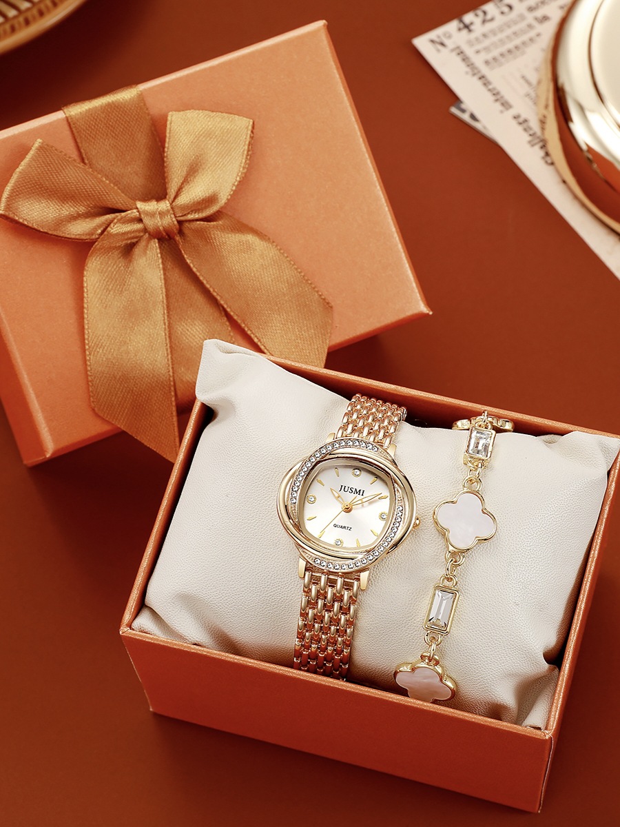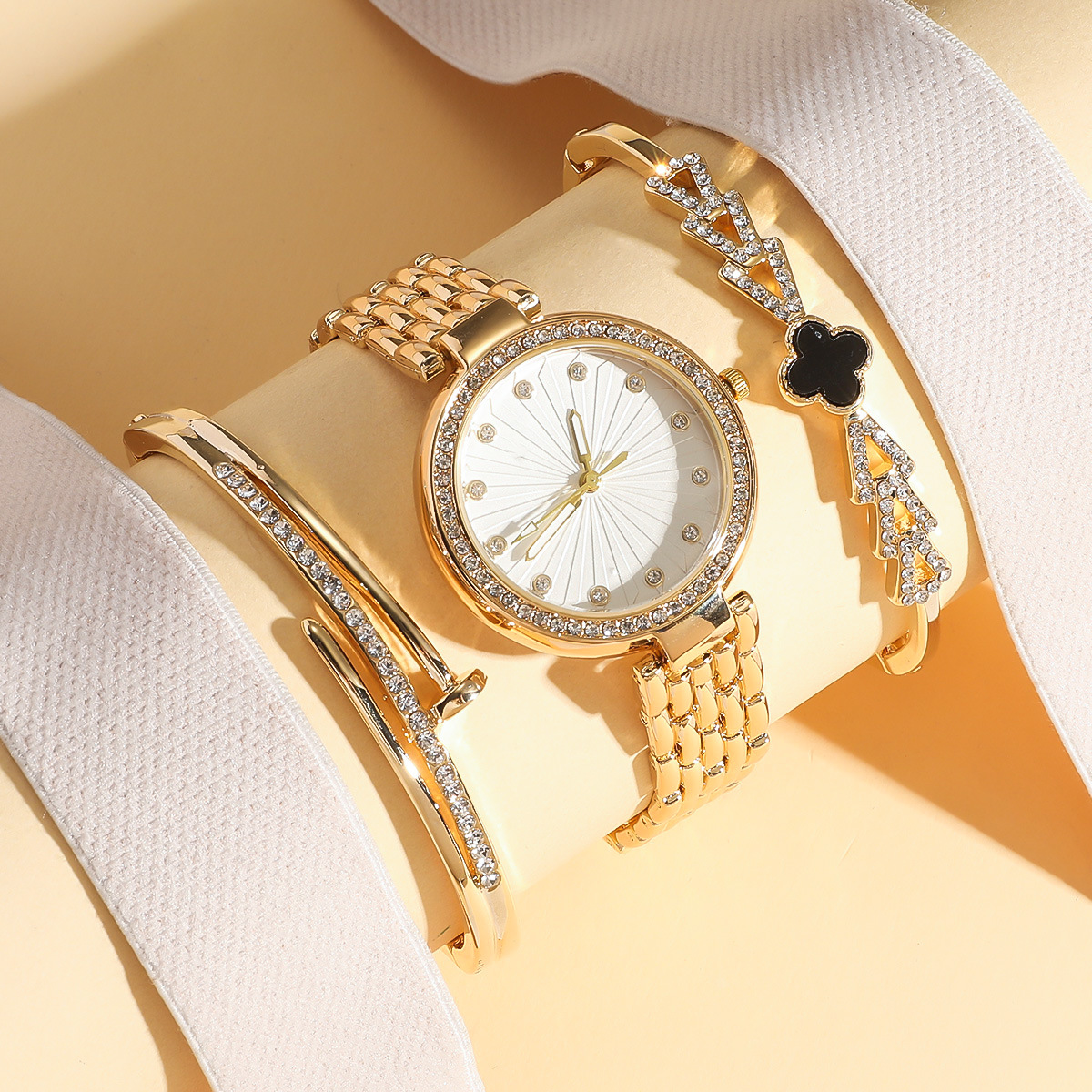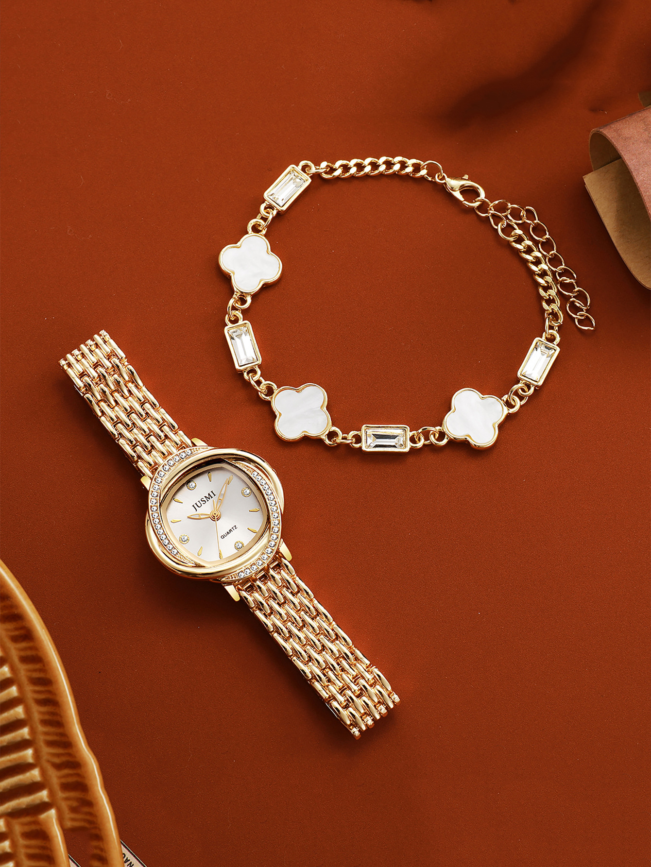 女士钢带表高级感清爽腕表圆形手表四叶草柳钉手镯手链首饰套装
