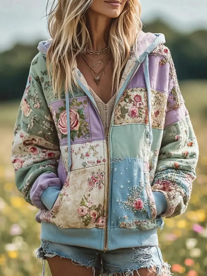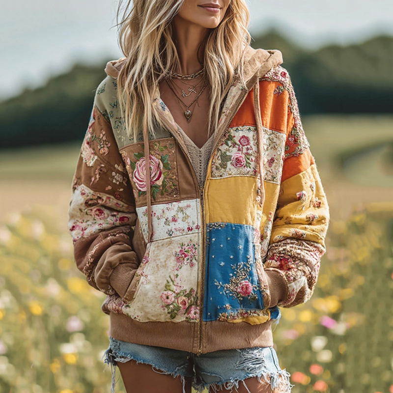 2025跨境亚马逊夏季女士新款花卉植物南瓜印花拉链卫衣时尚百搭女