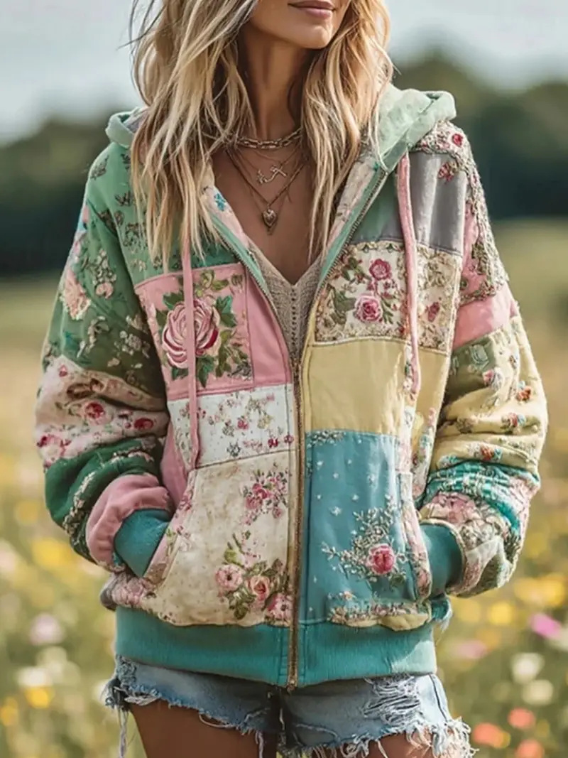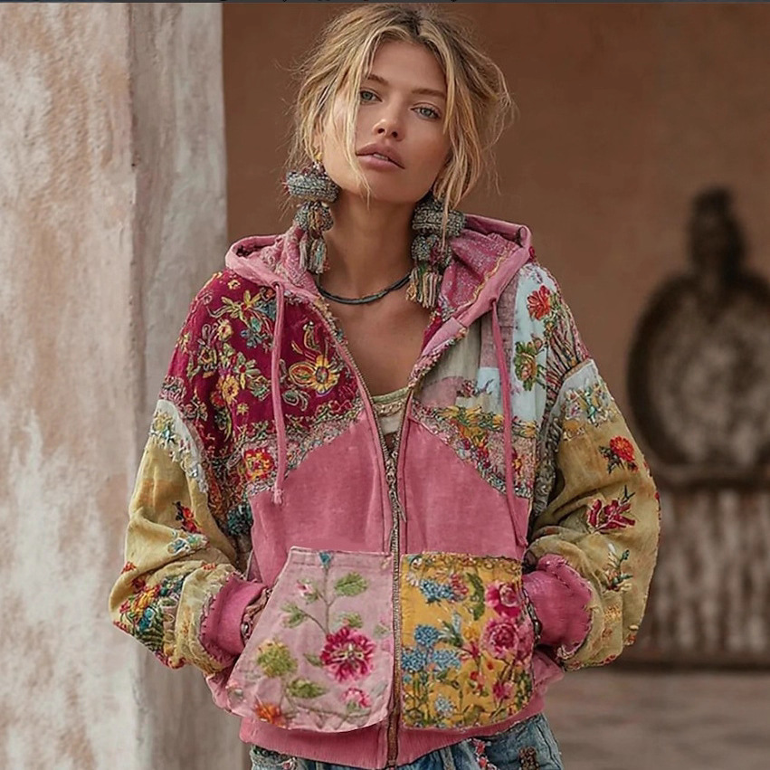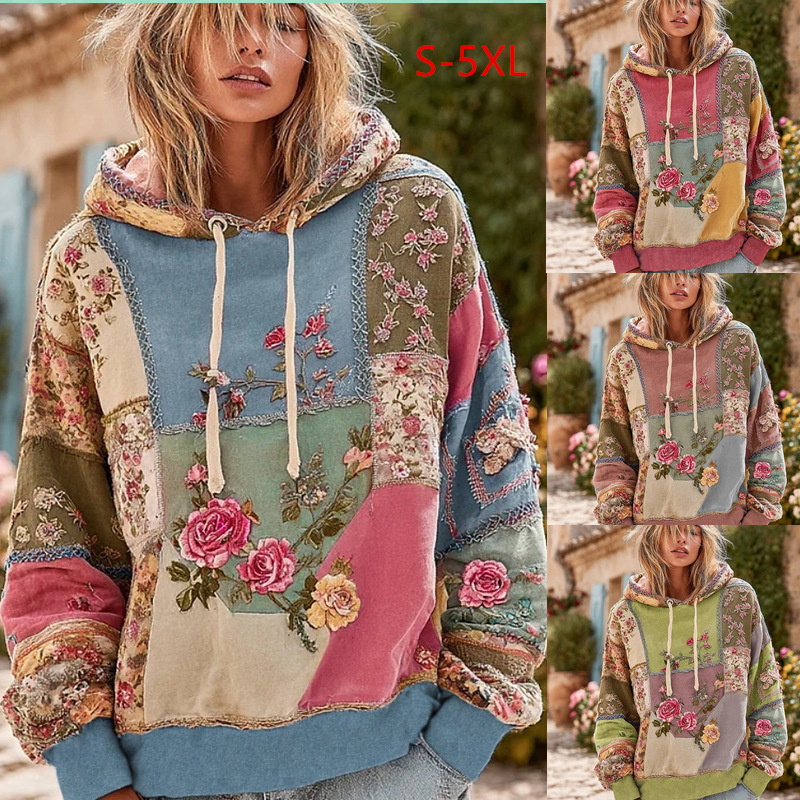 2025跨境欧美新款宽松女士休闲花卉印花帽衫