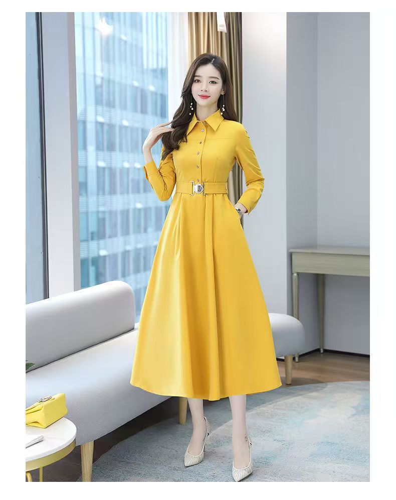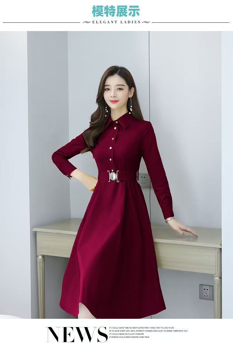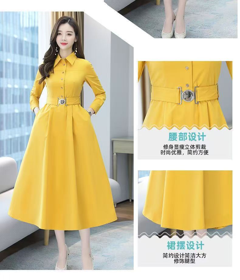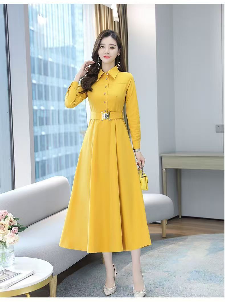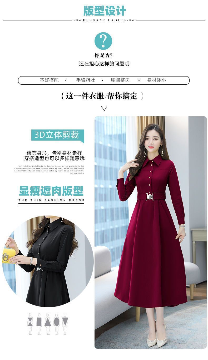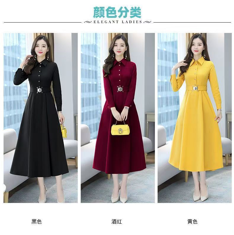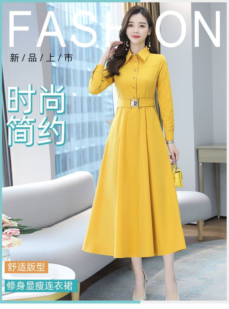 中長のpolo襟のワンピースの女性の春の新型の韓国版は腰の気質の広い奥さんの大きいサイズの長袖の簡単なスカートを収めます。