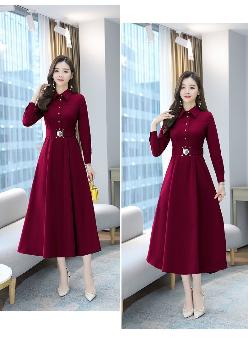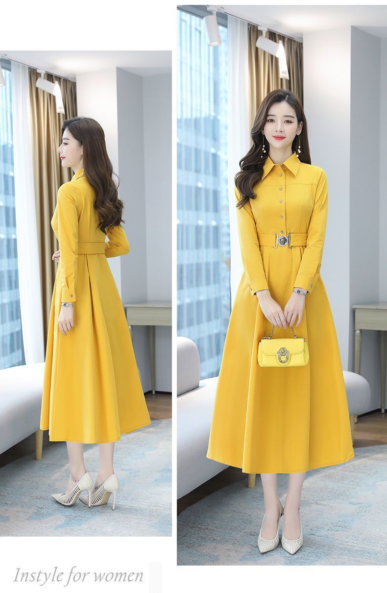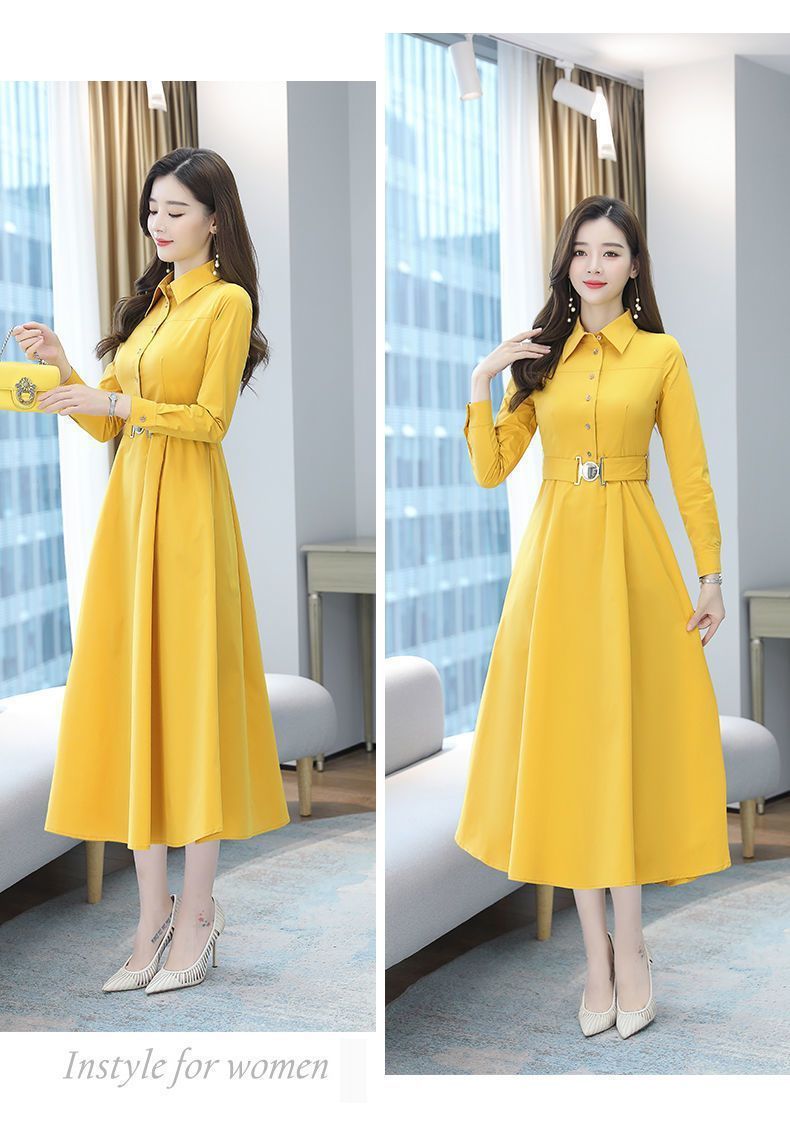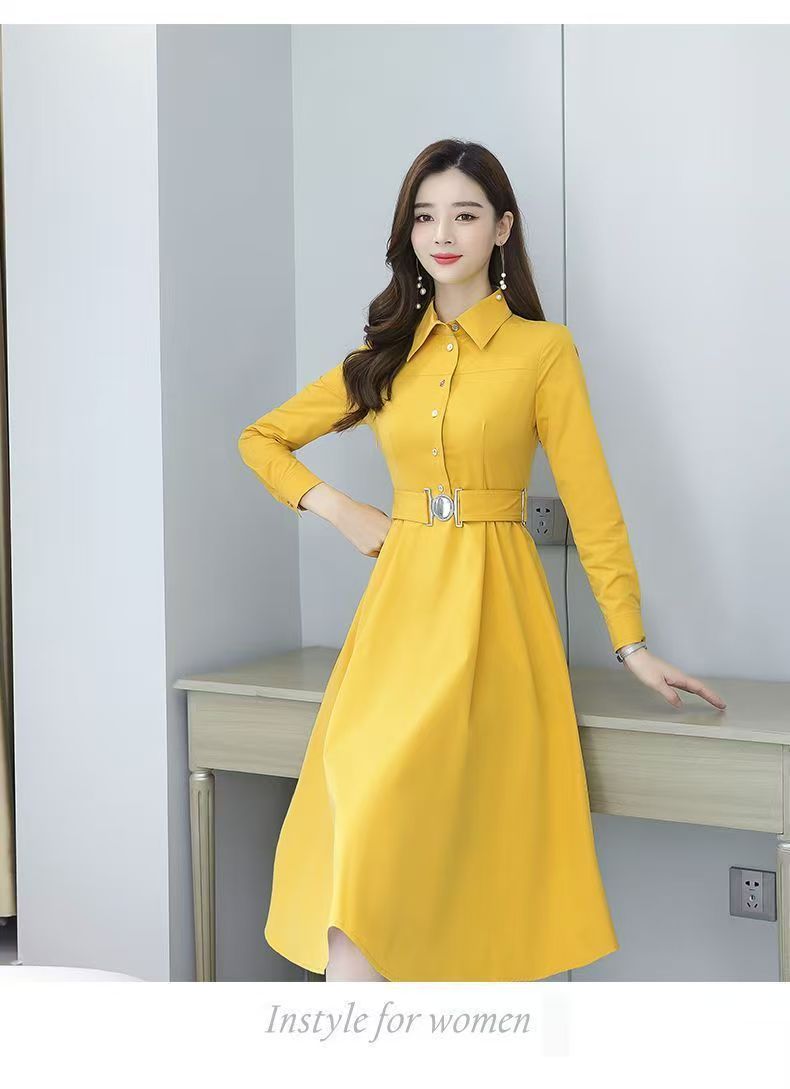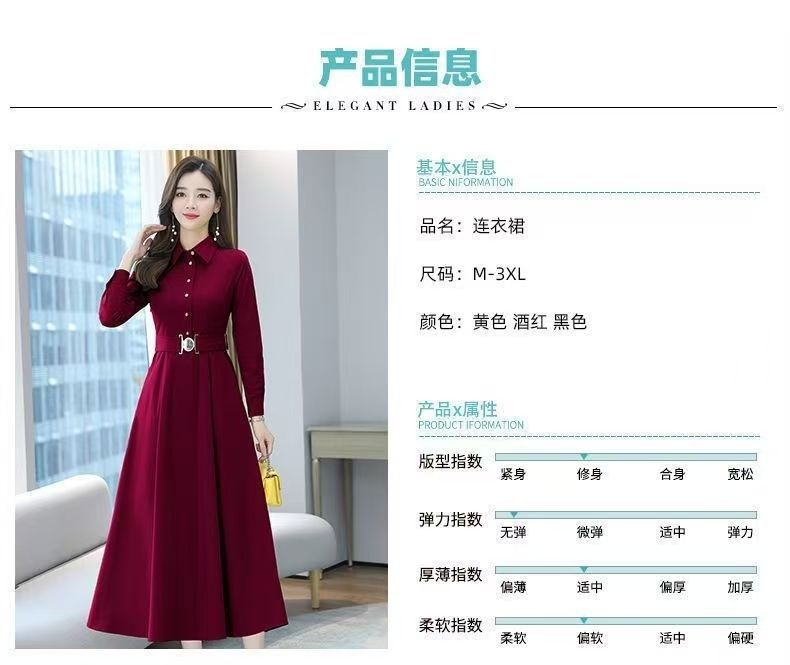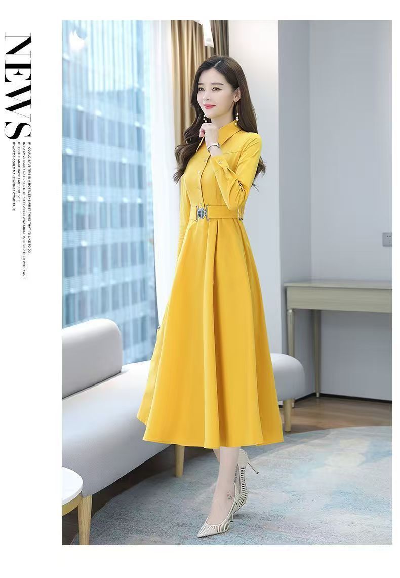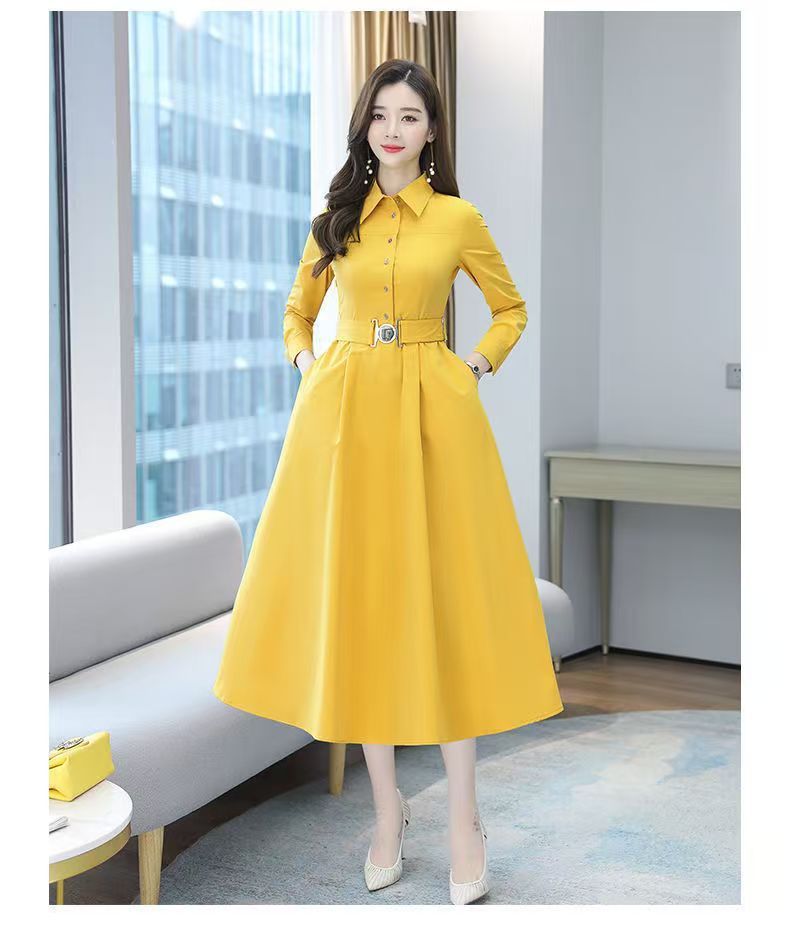 中長のpolo襟のワンピースの女性の春の新型の韓国版は腰の気質の広い奥さんの大きいサイズの長袖の簡単なスカートを収めます。