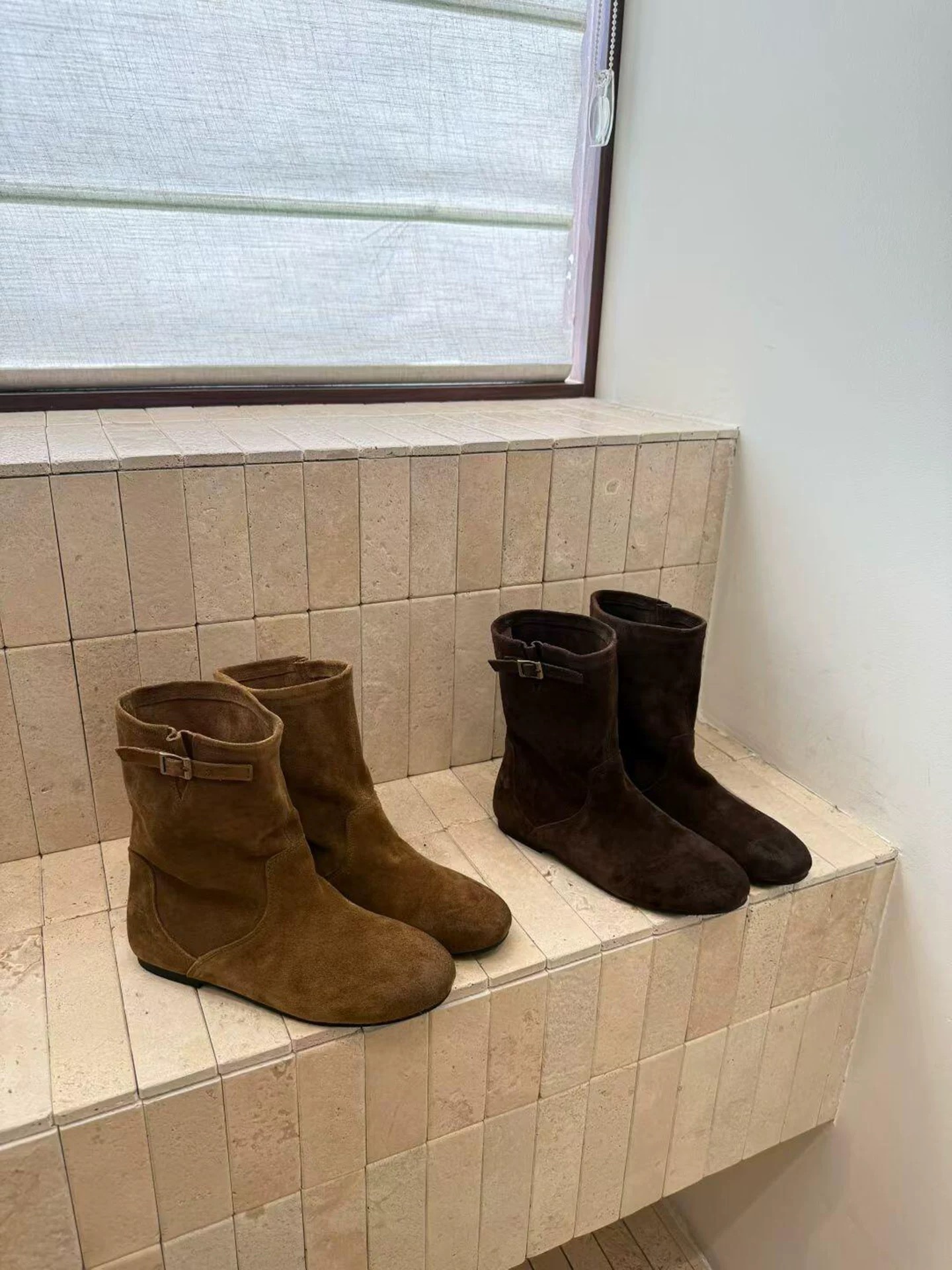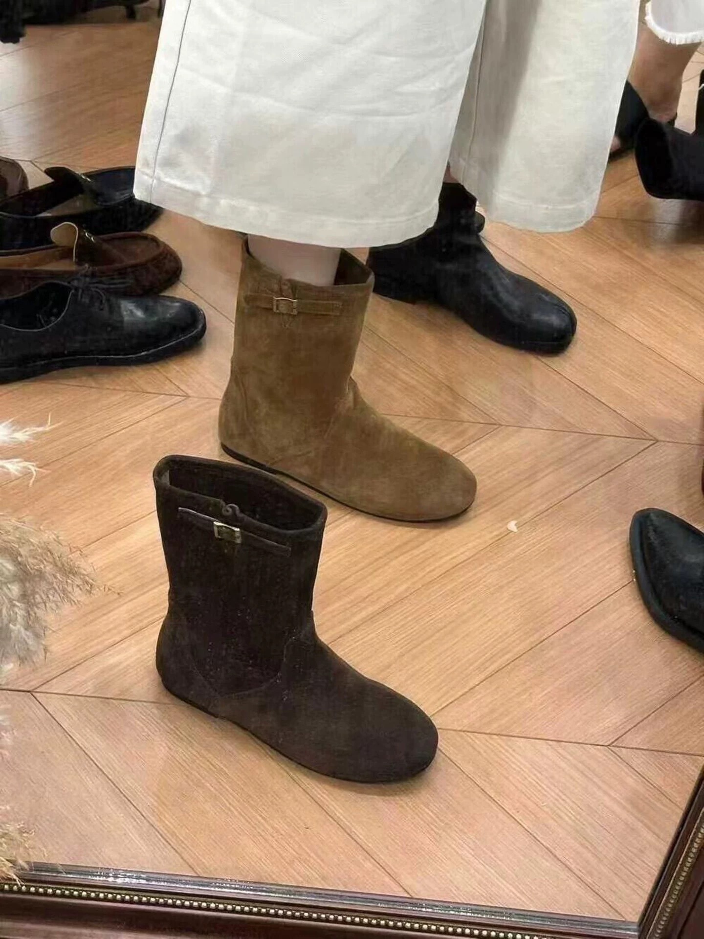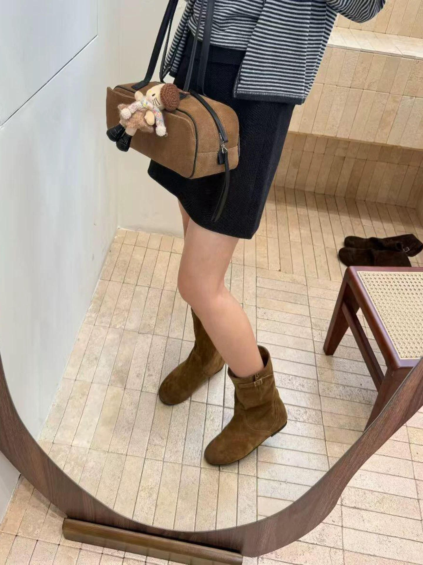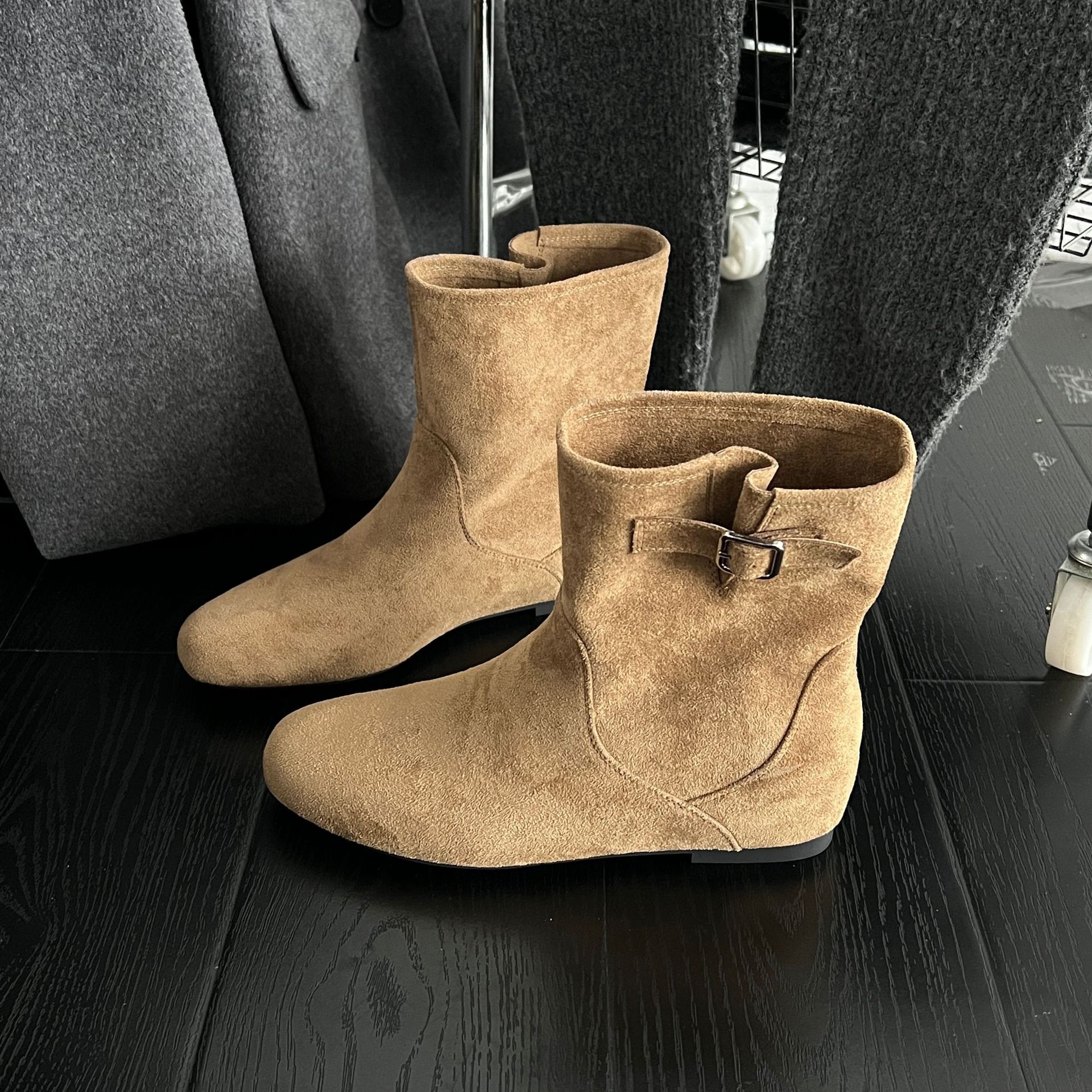 羊皮版~美拉德小众绒面圆头平底瘦瘦靴弹力短靴女2025新款牛仔靴