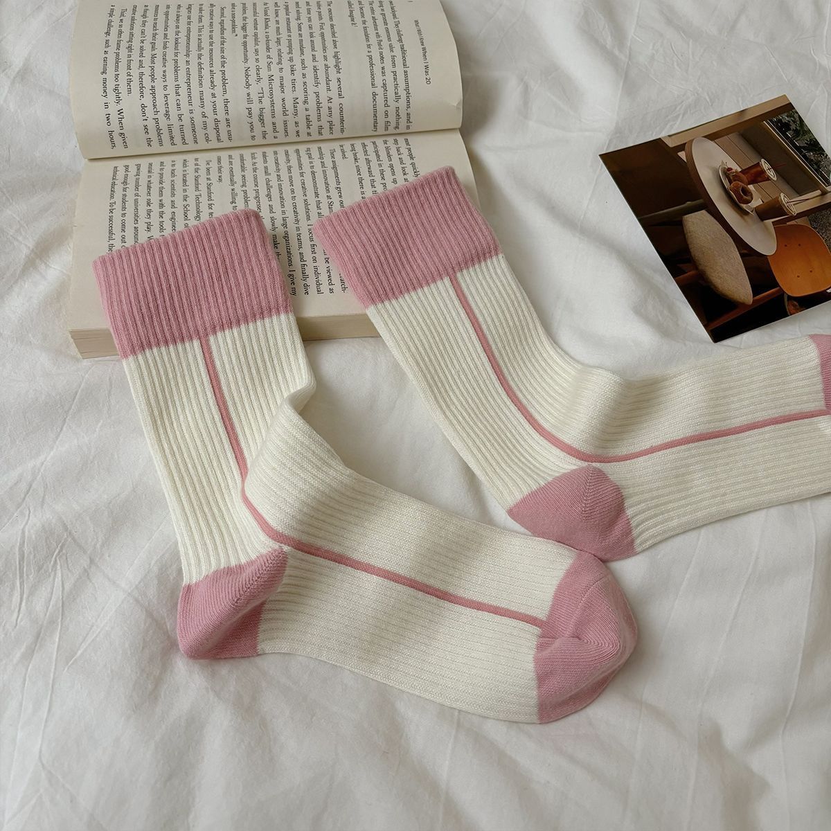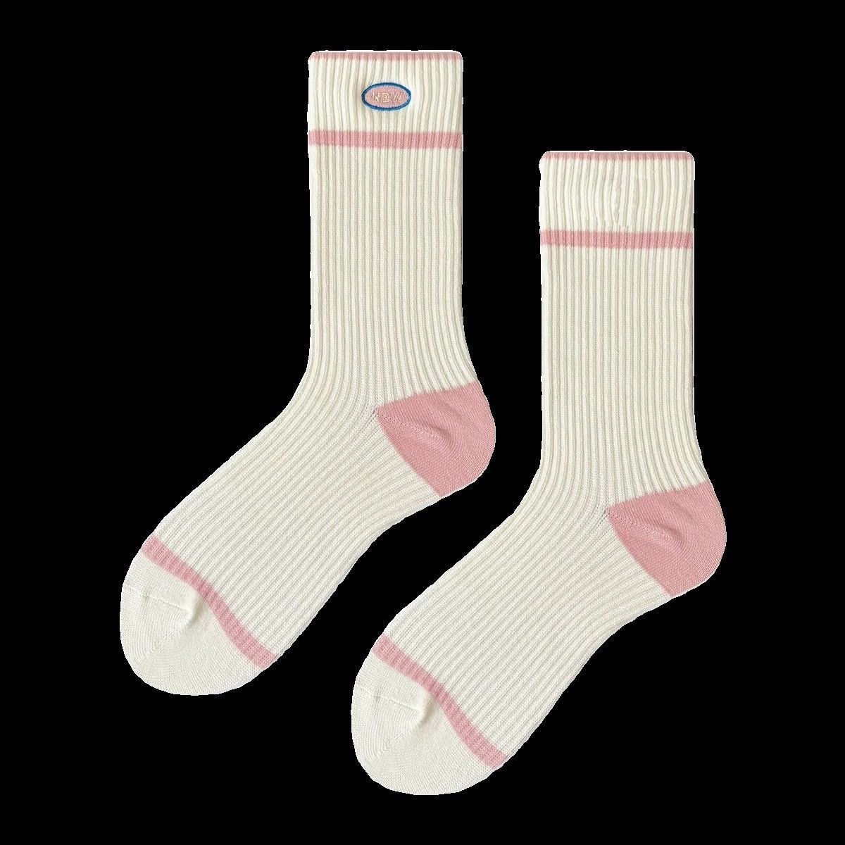 粉色鲨鱼袜子女ins潮百搭条纹字母学生中筒袜女运动袜简约韩系袜