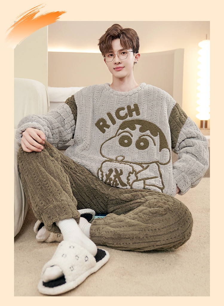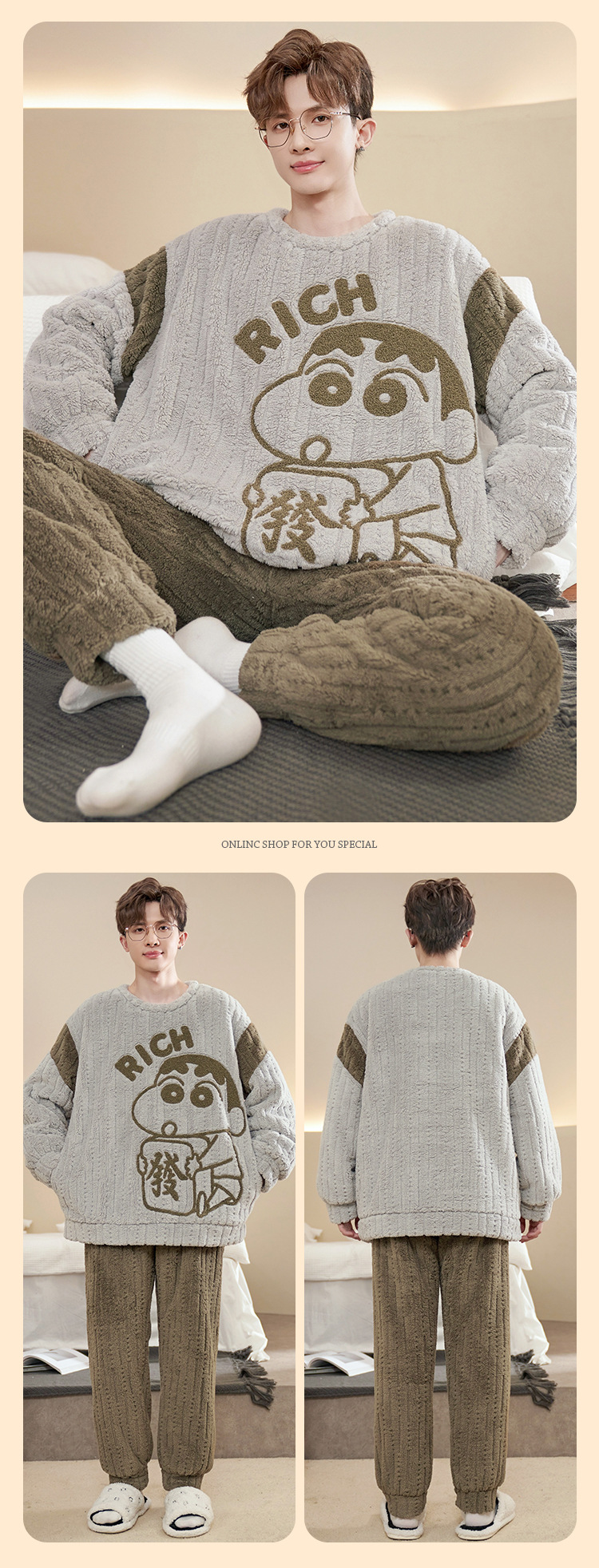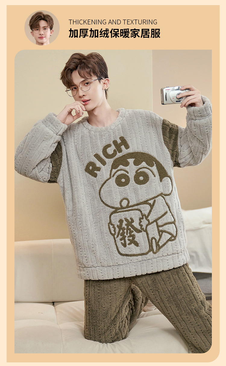 蜡笔小新珊瑚绒男款睡衣秋冬季学生大童青少年加绒加厚家居服大码