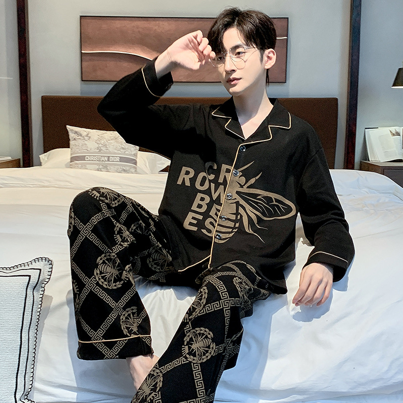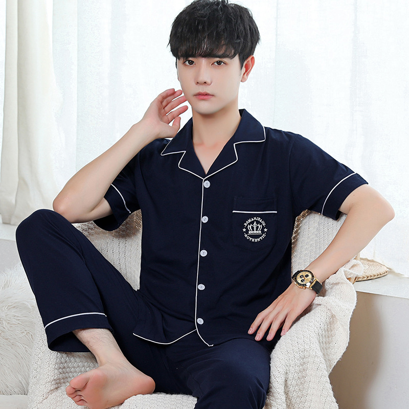 秋の純綿パジャマメンズ春と秋の長袖スーツ綿ティーンエイジャーホーム服メンズラペルピュアブルー