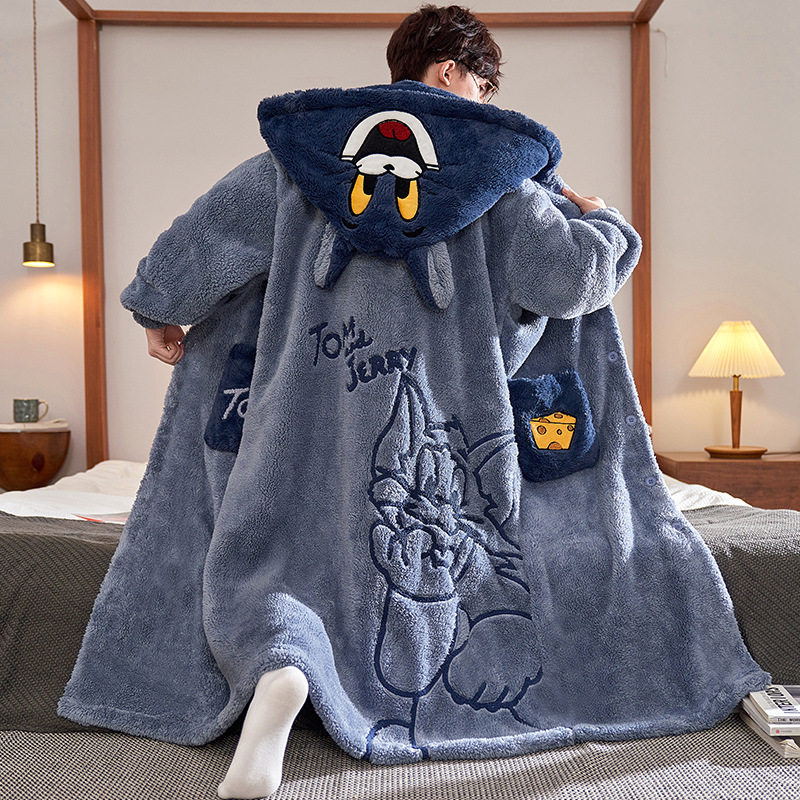 男士睡袍加绒加厚冬季珊瑚绒长袍加肥加大码卡通睡衣家居服可外穿