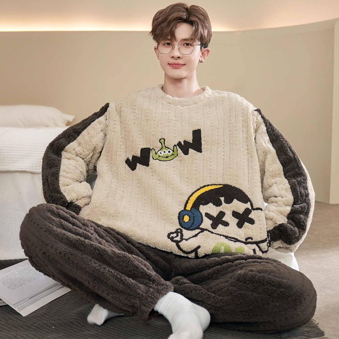 秋冬季男士睡衣珊瑚绒加厚加绒法兰绒冬天青少年男生家居服套装